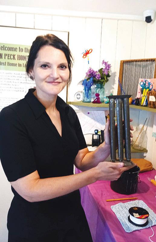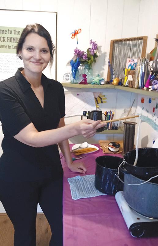 Laura Dubberke, education coordinator for the Lombard Historical Society, is eager to introduce children (and adults!) to pioneer life with the free “Hands on History” program on Thursdays from noon to 3 p.m. Here, she is seen (above left) making a candle the old-fashioned way, by dipping the wick in hot wax, after which it is dipped in cold water, then dipped in hot wax again, until it reaches the desired size. She is also shown (above right) holding a candle mold from the society’s collection, into which the hot wax would have been poured to create a candle. Dubberke said her basic focus is “kids in pioneer times,” and demonstrating how they would “use the materials that are around.” Upcoming crafts include rope making on July 24, pine cone animals on July 31 and a scavenger hunt on Aug. 7. Another free program is “Art @ the Peck” on Tuesdays from noon to 3 p.m. Upcoming crafts include a pine cone feeder on July 29 and pipe cleaner dragonflies on Aug. 5. Visit lombardhistory.org for more information.