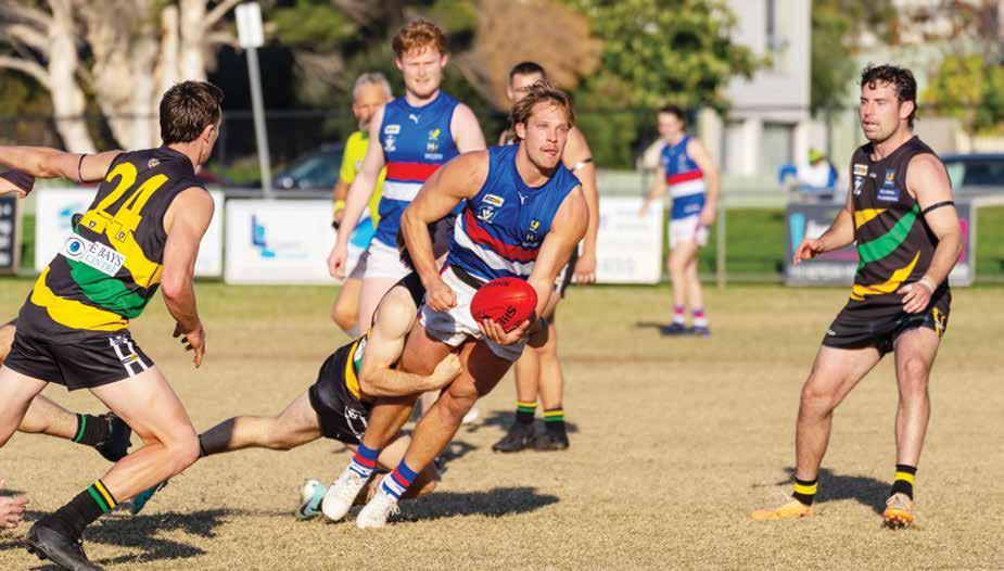 After a tight first quarter, a threegoals-to-zero second quarter put the game beyond Frankston’s reach. Mornington Blue ran away with it 2.4 (16) to 7.10 (52). Jaime Davis, Ashley Jans, Mia Johnson, Elizabeth Muir, and Jessica Stepanavicius were named their best. Lucy Grocock booted three goals and Hayley Monk scored two.