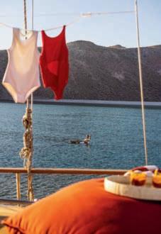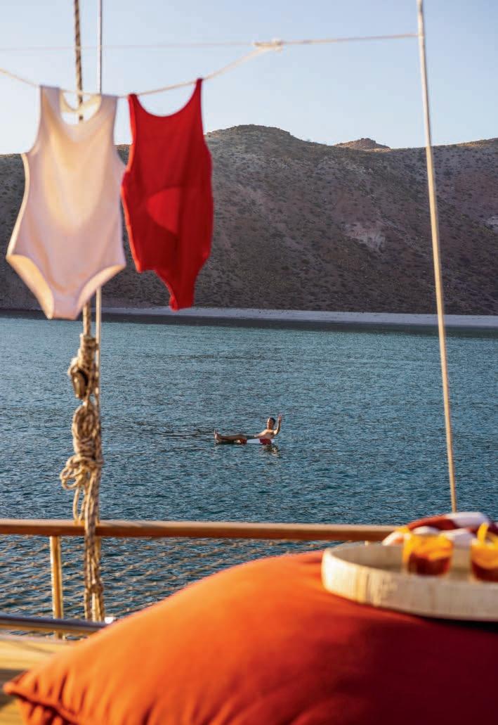 “This is still my favourite Monday,” says photographer Romana Lilic. She hardly noticed Wi-Fi and cellphone service drop as her gulet, a wooden sailing yacht, neared Isla San José and Isla San Francisco: A pod of dolphins had been tailing the boat for half an hour. After a dip in the Sea of Cortez, fresh negronis and the catch of the day made for a dreamy dinner under the stars. « Ça reste encore et toujours mon lundi préféré », déclare la photographe Romana Lilic. Elle avait à peine remarqué la diminution des signaux wi-fi et de cellulaire, au moment où sa goélette en bois s’approchait des îles SanJosé et San Francisco avec depuis une demi-heure, un banc de dauphins à sa remorque. Après une baignade dans la mer de Cortés, negronis rafraîchissants et le poisson du jour ont constitué un souper de rêve sous les étoiles.