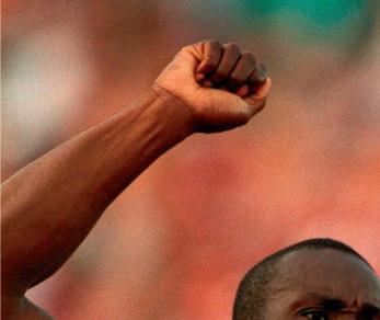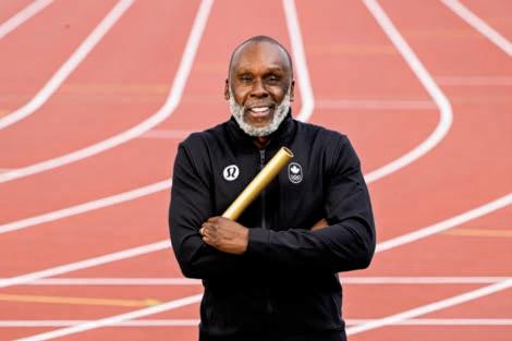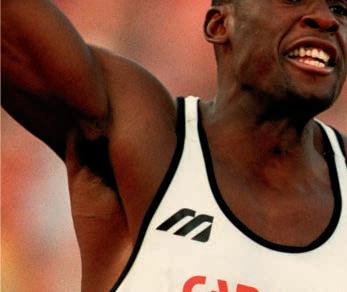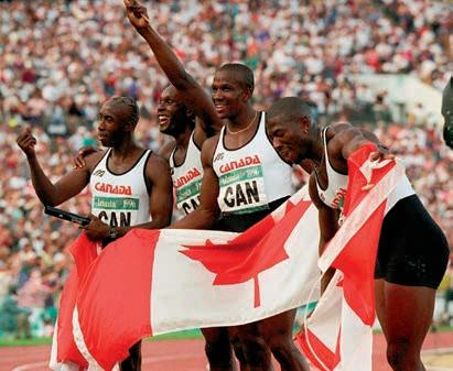 Bruny Surin celebrates gold in the 4x100 metre relay at the 1996 Atlanta Summer Olympic Games. Bruny Surin célèbre l’or dans le relais 4 x 100 mètres aux Jeux olympiques d’été d’Atlanta en 1996.