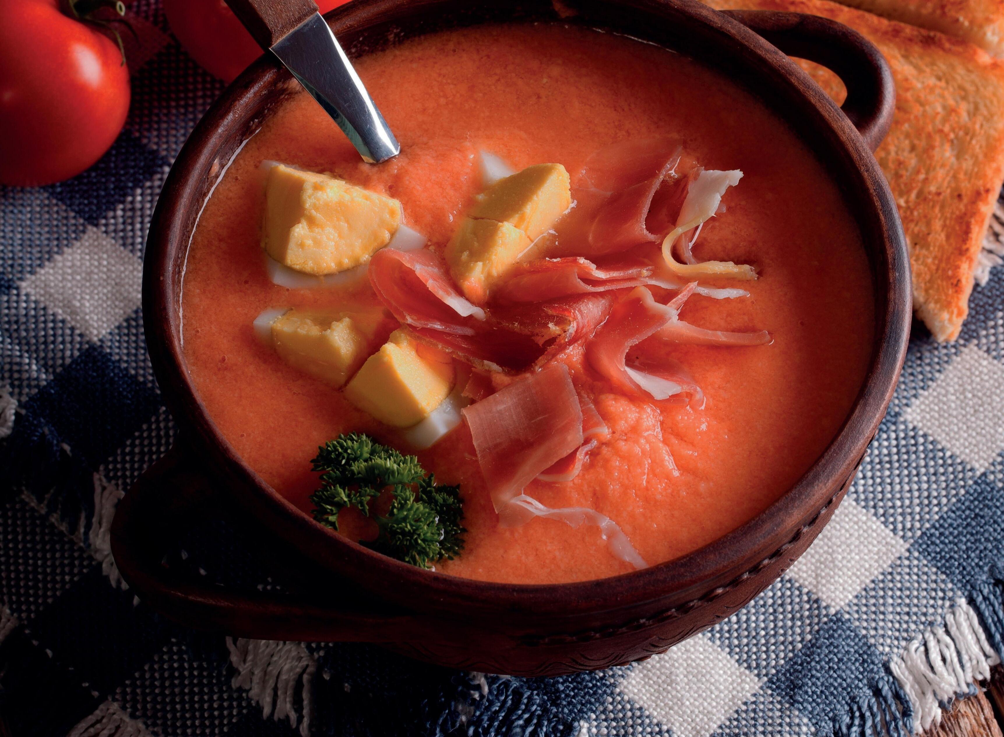 我们美食文化中的另一道重要菜肴是 清凉的蔬菜汤(gazpacho), 这道凉 汤用西红柿、黄瓜、大蒜、洋葱和甜 椒制成,浓缩了安达卢西亚的滋味。 这是一道健康的凉汤,也是夏日炎热 迫使我们休憩时,桌上常见的佳肴。