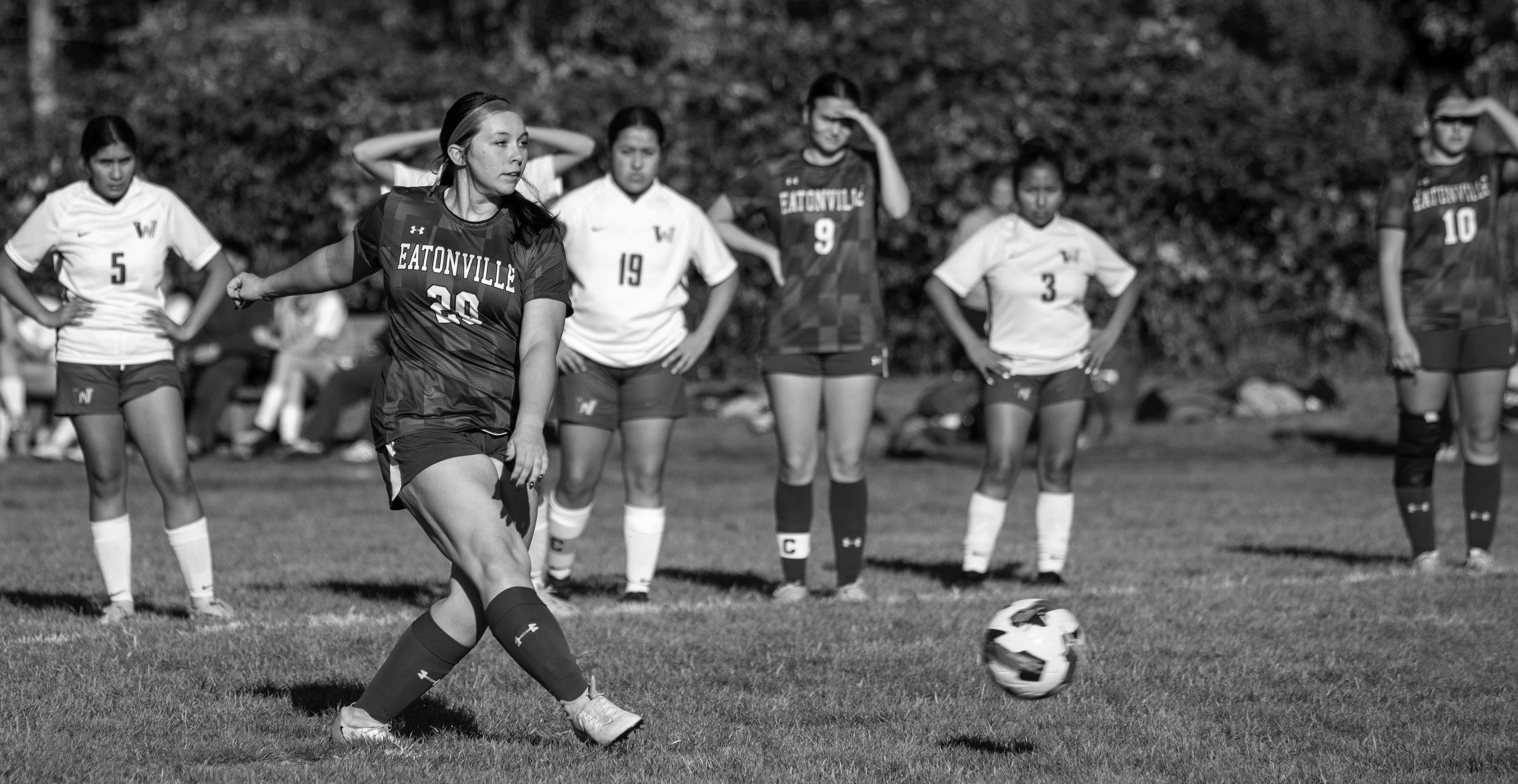 Eatonville's Lucy Allen takes a penalty kick against Washington. Allen would be successful on the kick to help the Cruisers shutout the Patriots 2-0.