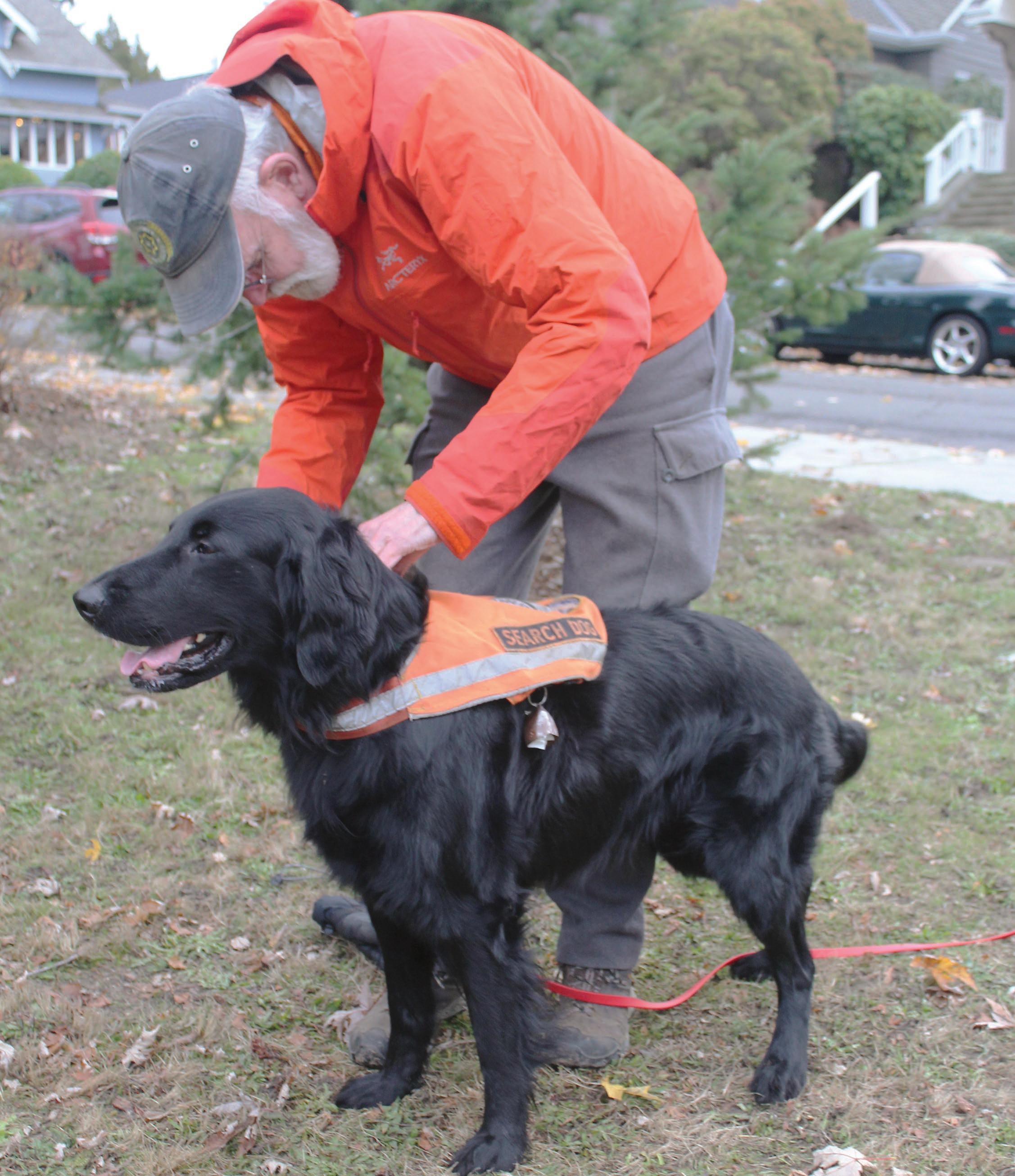 Queen Anne resident Jon Izant secures a King County Search Dogs vest on his 5-year-old at-coated retriever, Lincoln, for a quick training exercise last week. When Lincoln hears the bells on his harness jingle, he knows it is time to go to work doing air scent search and rescue work.