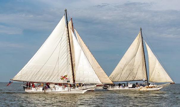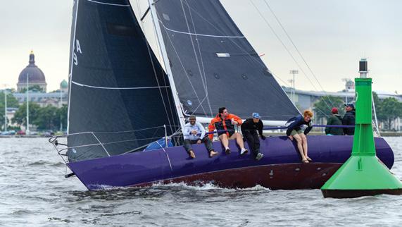 Most sailors knew the northwesterly couldn’t hold out against forecasted high air temperatures in the mid-90s and a highpressure dome off Hatteras. With this in mind, teams began picking their side of the Bay and attempting to keep their bows as close to red #80 off Sharps Island as possible. The breeze slowly and painfully executed its counterclockwise death march that ended with the gentle and warm breeze occasionally smelling of Assateague low tide and coming from as far east as the 140 on the compass.