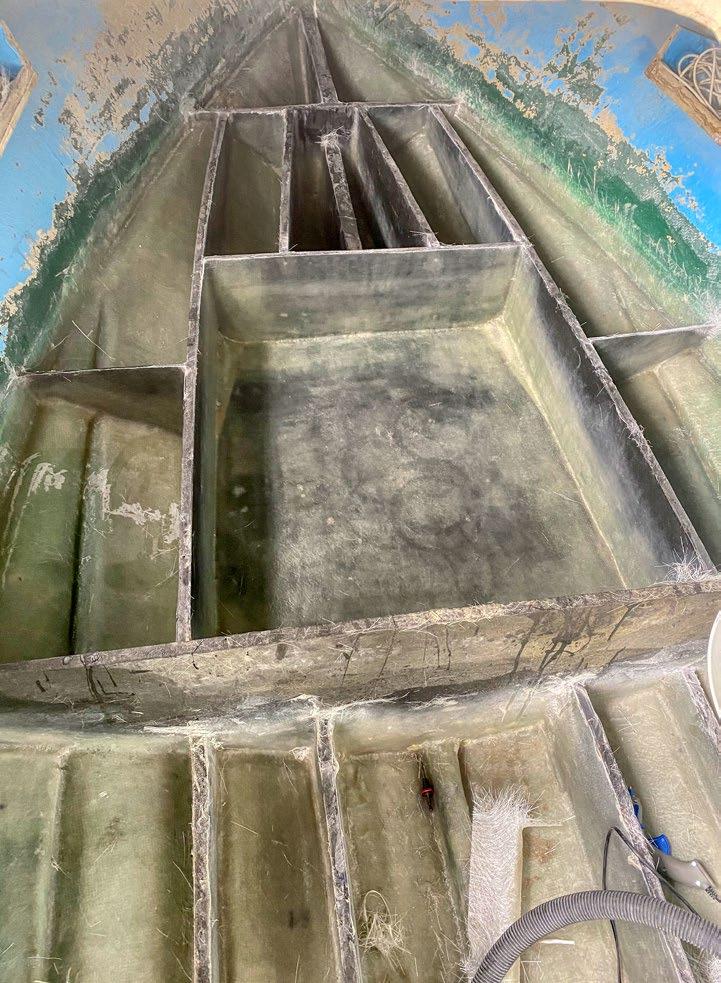 Now onto the floor, I templated and cut out all the floor and storage compartments and glued, screwed, and glassed them in. I then modified the rear section to work with the 25 inch transom, cut out the moulded seats, built a live bait tank and glassed it all back onto the boat. Removing this whole rear section was probably one of my biggest regrets of the whole build as it was a lot of work to get back on and lined up correctly with lots of glassing fairing, etc. If I had my time again, I would cut it out on the inside and leave the gunnels intact.