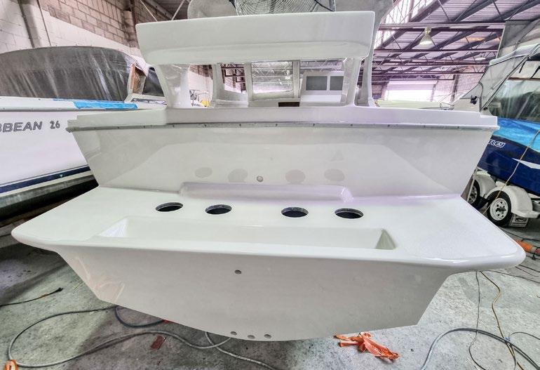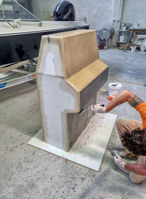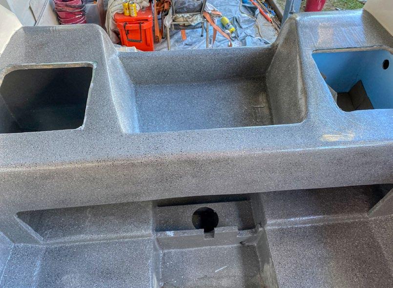 She received a complete rebuild from the bottom up. The hull received new internal layers of woven rovings along with entirely new stringers, transom and floor. For added safety, rigidity and acoustic deadening, the cavities were all foam filled and the side pockets, cabin structure, fuel cavity, bilge and the actual transom layout were all transformed to George’s ideal requirements. The walk up transom layout was formed to support a pair of Suzuki 140HO 4-stroke outboards, giving plenty of grunt and torque for staying on the backs of large swells in those nasty offshore conditions.