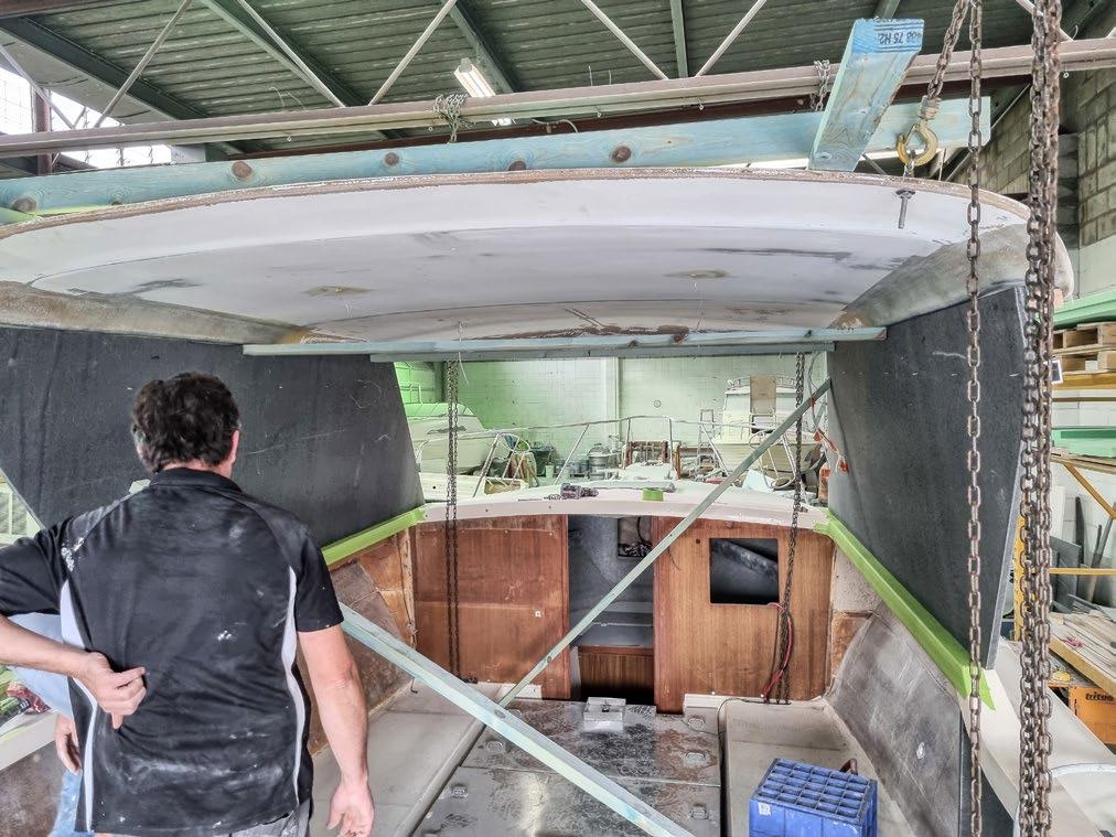 Now came the time to flip her over and work on the bottom. I was shitting myself about doing this and worried about dropping it, but with a few block and tackles, some chains and a 4wd winch, I had her upside down without incident. Now I had to remove nearly 50 years of minor repairs done to the underside of the hull, and grind off the dodgy paint job to get everything back to the original gel coat. I then marked up all the chips, scratches and other imperfections and ground them all back to bare glass. I then glassed all those spots up and faired everything out, ready for a new gel coat. While the boat was in the upside down position, I climbed inside and flow coated all the hard to reach areas which would generally be upside down (i.e., underside of gunnels, ceiling of cabin etc).