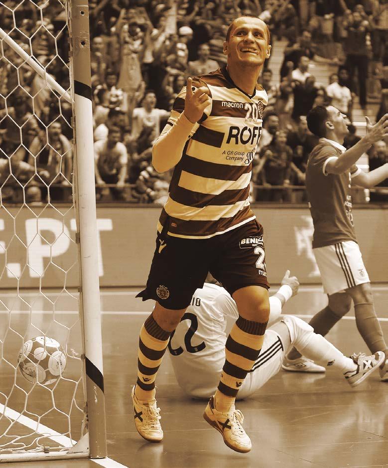 vez na história após 2011 − a final da então denominada UEFA Futsal Cup (hoje UEFA Futsal Champions League), prova em que começava a ganhar cada vez mais peso, mas da qual acabaria por sair derrotado frente ao Inter Movistar (0-7). Pelo meio, em Janeiro, o ítalo-brasileiro foi ainda eleito o sétimo melhor jogador do Mundo. Quanto a 2017/2018, na terceira e última temporada de Leão ao peito, o número 20 verde e branco contribuiu, com 38 golos em 43 partidas, para a conquista do Tricampeonato Nacional − foi um dos doze jogadores Leoninos que estiveram presente nos três títulos – e da Taça de Portugal: a segunda ‘dobradinha’. Foi decisivo nos cinco jogos da final do Campeonato Nacional frente ao SL Benfica (3-2), que na altura foi apelidada como sendo “a melhor de sempre disputada em Portugal”, assinando seis golos e três assistências. Pelo segundo ano consecutivo, o Sporting CP cimentou a posição na Europa e chegou mais uma vez à final da UEFA Futsal Cup, mas voltou a não levar a melhor sobre o Inter Movistar (2-5).