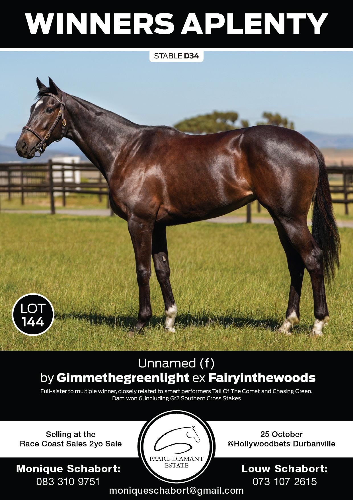 Paarl Diamant’s Monique Schabort will be bringing a very smart draft to this year’s Two-Year-Old Sale, with this consignment including two-year-olds sired by the likes of Erik The Red, Gimmethegreenlight, Master Of My Fate, One World and Rafeef.