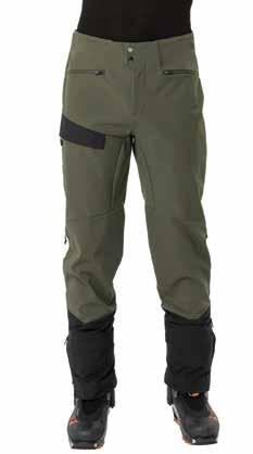 Pantaloni softshell antivento e idrorepellenti, sono al 100% antivento e trattati con Eco Finish senza PFC per la resistenza all’acqua. Durante le salite garantiscono una ventilazione efficiente grazie alle lunghe zip laterali con rete integrata, senza tuttavia compromettere la protezione dalla neve. I polsini rinforzati delle gambe assicurano lunga durata anche a contatto con rocce, lamine degli sci o ramponi. La vita a basso profilo resta confortevole anche con un’imbragatura da arrampicata, mentre una tasca aggiuntiva sulla gamba offre spazio per un Artva, un telefono, una mappa topografica o un cappello.