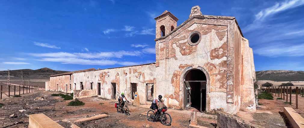 A El Cortijo del Fraile, un vecchio eremo dismesso, un cartello in legno ci informa che qui furono girate scene de “Il buono, il brutto e il cattivo” e “Per qualche dollaro in più”, entrambi con Clint Eastwood e di Sergio Leone, di “Io sono la rivoluzione” con Gian Maria Volontè e Klaus Kinski e de “I quattro dell’Ave Maria” con Bud Spencer, Terrence Hill e Eli Wallach, oltre a tanti altri meno noti. Il silenzio assordante che abbraccia l’eremo è interrotto solo dal nostro vociare e da fantasiose pistolettate, piuttosto che ipotetici tocchi di campana, che risuonano silenziosi nei nostri pensieri. Il fascino del vecchio West ci ha rapiti del tutto e pedalando verso l’infinito, nelle soffici luci dell’ennesimo tramonto, fischiettiamo le celebri colonne sonore di Ennio Morricone, che con la sua musica ha contribuito a render magiche queste location.