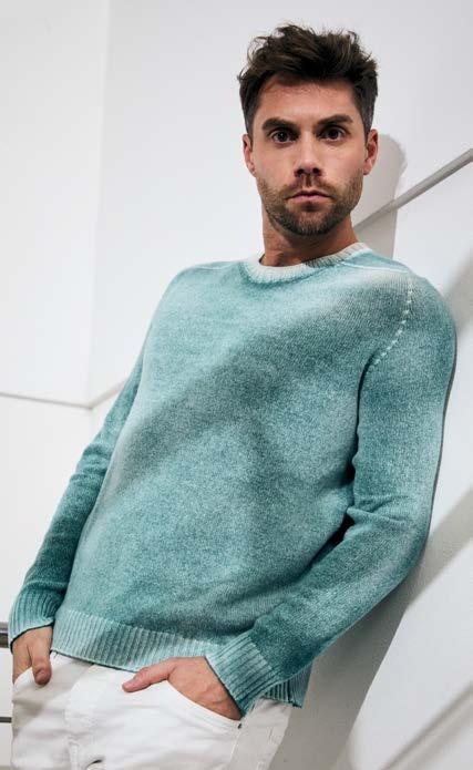 Svevo breaks the mold with the crewneck sweater featuring hand-painted aerographed details on the collar, waist, and cuffs, using an innovative, washresistant pigmentation that is imperceptible to the touch. The colors evoke the vibrant 80s, from navy to raspberry, and optical white.