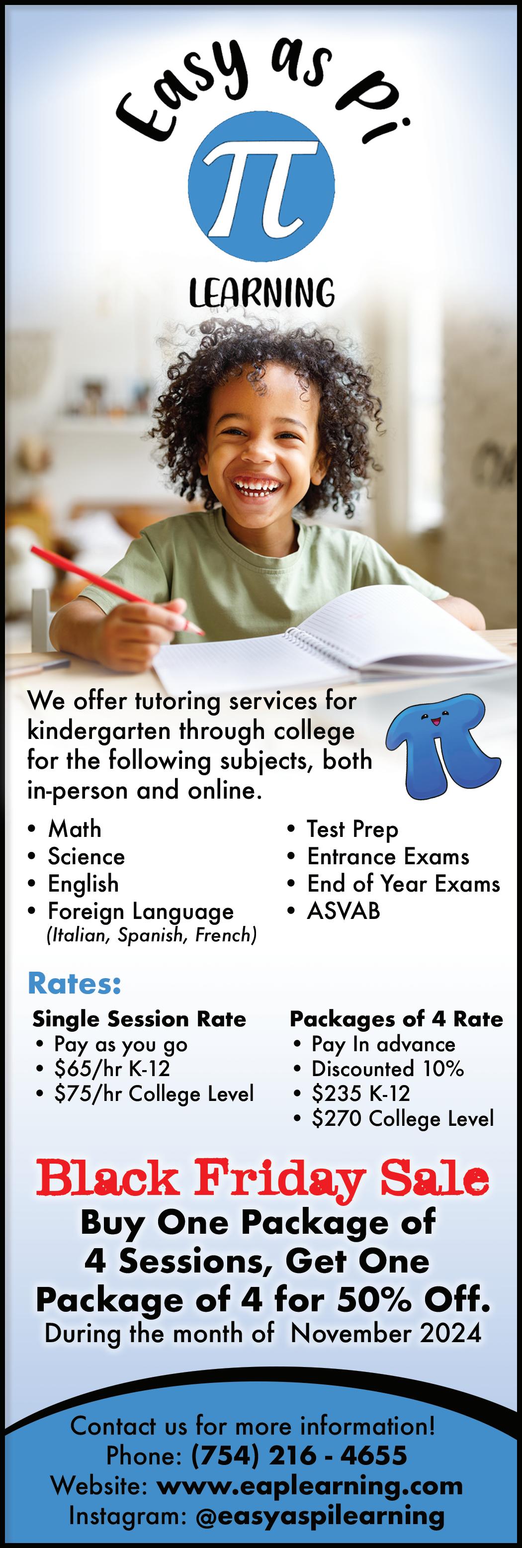 Ages 5-18+. Offering tutoring services for students in grades kindergarten – college. Services are available in-person and online. Subjects include math, science & English. Tutoring for foreign language study in Spanish, French & Italian is also available. Test Prep assistance for Entrance exams, End-of-year exams, ASVAB. Single session rates: K-12 $65/hr; College Level $75/hr. 10% discount for Package Rates: K-12 $235/ 4 sessions ; College Level $270/4 sessions. Tutoring Packages 20% off during August 2024: $208/4 sessions; $312/6 sessions; $416/8 sessions. Register today and get ahead this school year! Call us at (754) 216-4655 or register online at www.eaplearning.com or IG: @easyaspilearning.