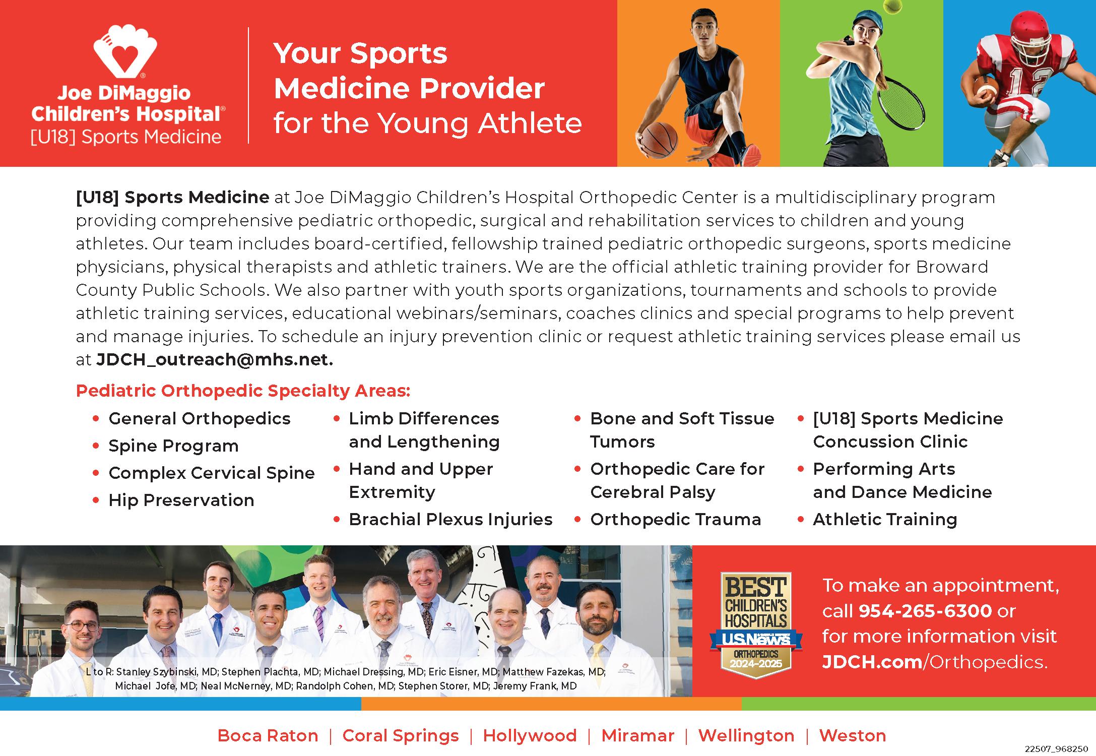 • PEDIATRIC ORTHOPEDIC SURGERY & [U18] SPORTS MEDICINE: Meeting the needs of the pediatric & adolescent population with orthopedic injuries ranging from scoliosis and spinal deformities, bone tumors, fractures, hand injuries and upper extremity conditions, limb lengthening & deformities, hip injuries & hip disorders, concussions, sports & dance injuries and much more, your child will be cared for by fellowship-trained pediatric orthopedic surgeons and physicians: Dr. Michael Jofe, Dr. Randolph Cohen, Dr. Neal McNerney, Dr. Stephen Storer, Dr. Jeremy Frank, Dr. Eric Eisner, Dr. Matthew Fazekas, Dr. Michael Dressing, Dr. Stephen Plachta & Dr. Stanley Szybinski who combined have over 80 years’ experience. We provide a full spectrum of care, with diagnostic imaging by pediatric radiologists and technologists, anesthesia care by boardcertified pediatric anesthesiologists and rehabilitation by licensed and doctorate level physical therapists. The Joe DiMaggio Children’s Hospital Orthopedic Center has been ranked by U.S. News & World Report 2024-2025 10 years in a row as one of the top pediatric orthopedic programs in the nation. Locations in Boca Raton, Coral Springs, Hollywood, Miramar, Wellington & Weston. JDCH.com/Orthopedics.