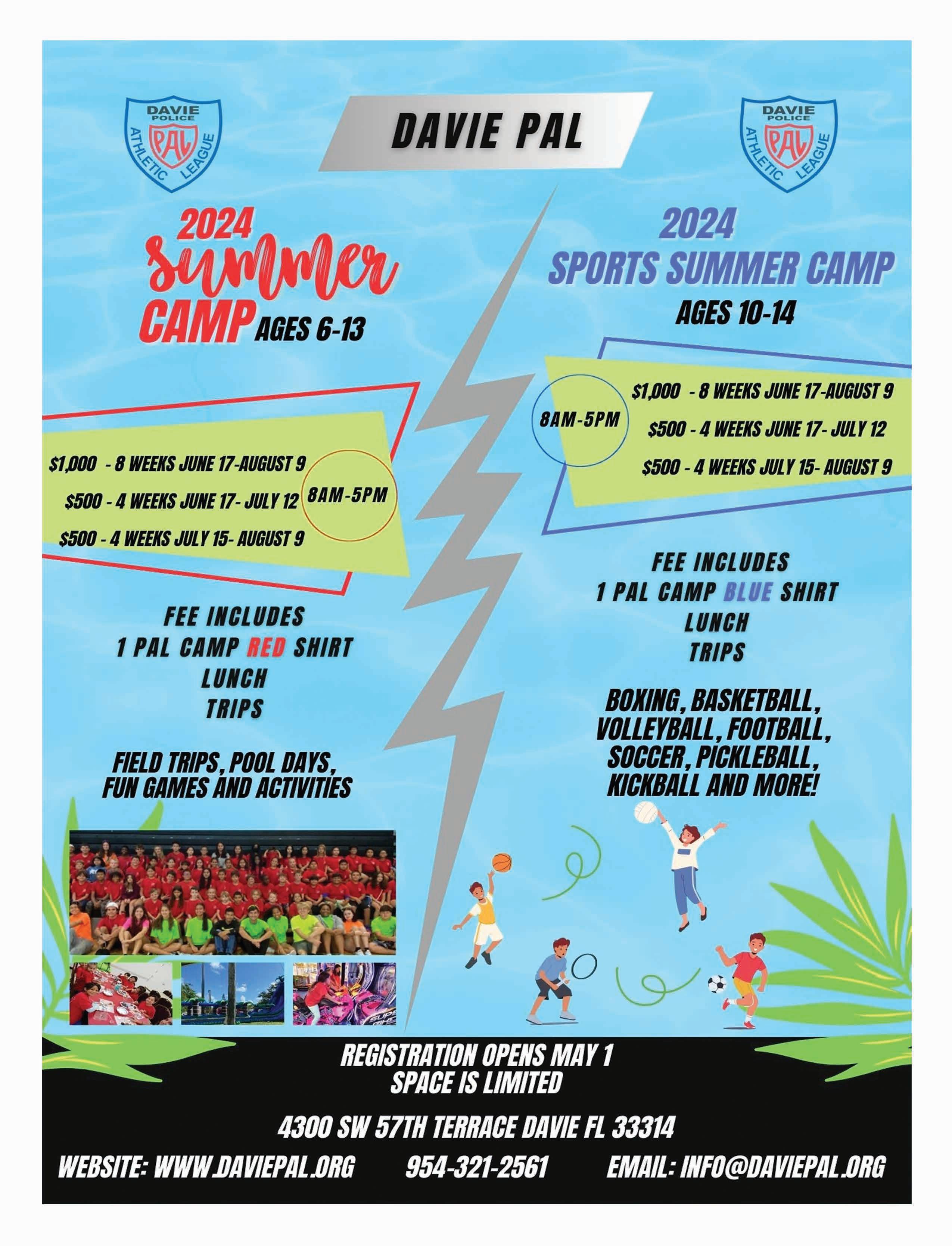 The City of Cooper City is proud to provide a variety of recreational activities including swimming, field trips, games, arts and crafts, and so much more! Camps hours are Monday through Friday 7:30AM6:00PM. Registration opens to Cooper City residents on April 4 and to non-residents on April 25. Registration spaces are limited and will be on a first come, first serve basis. Visit https://bit.ly/CC_camps for a full list of upcoming camps, sessions, and pricing.