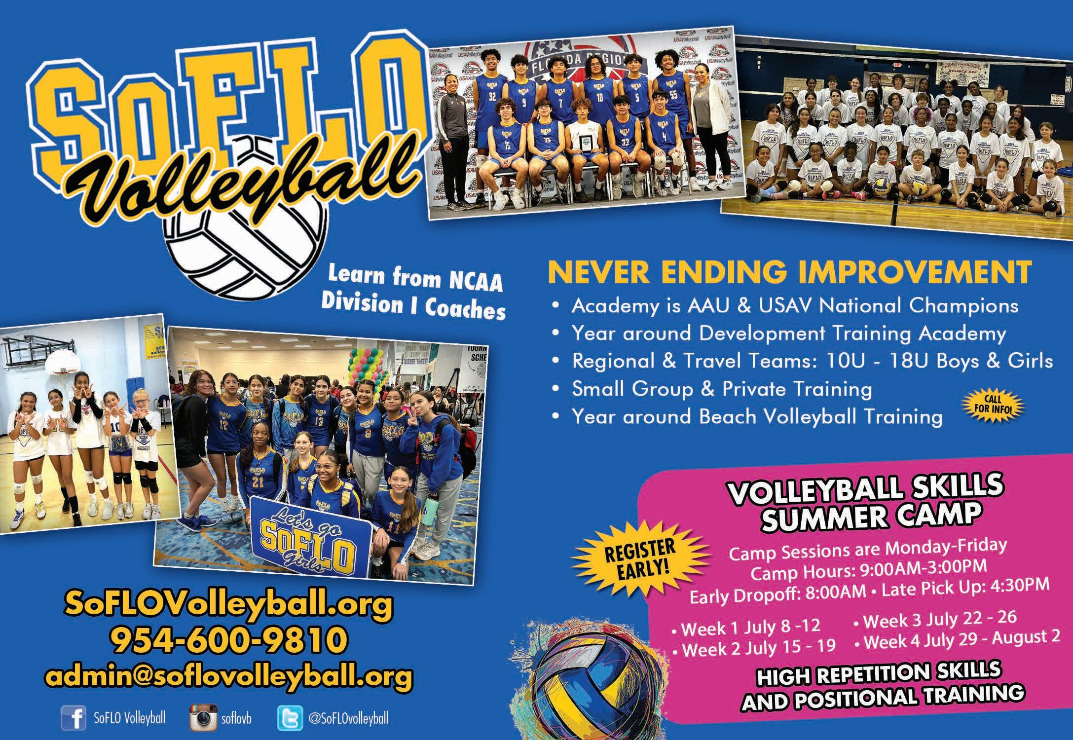 Volleyball skills summer camp for boys and girls ages 10-18. Learn high repetition skills and positional training. Camp Sessions are MondayFriday 9:00AM- 3:00PM. Early drop off at 8:00AM & late pick up at 4:30PM are also available options. Sessions: July 8-12; July 15-19; July 22-26 and July 29-August 2. Learn from NCAA Division I Coaches. Our academy is AAU & USAV National Champions. We offer year-round Beach Volleyball Training. Space is limited. Call 954-600-9810 or email admin@soflovolleyball.org to register. www.soflovolleyball.org.