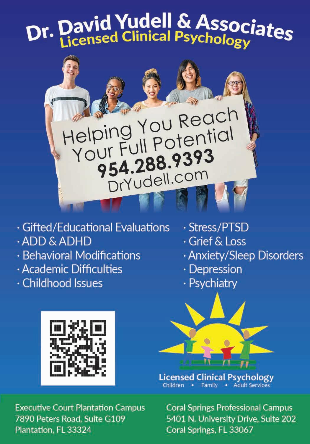 Our private practice office is available for confidential and professional help. All individuals, couples, families and/or groups are welcome. We specialize in children, adults and families, offering educational testing as well as therapeutic services. Services include educational testing such as GIFTED PLACEMENT, ADD & ADHD, ACT & SAT accommodations, academic deficits, learning disabilities and behavioral problems. We also offer help for those dealing with stress, grief & loss, anxiety, sleep disorders, OCD, substance abuse, fears & phobias or depression. Please call our office to discuss your needs. We are conveniently located in Coral Springs and Plantation. (954) 288-9393. www.DrYudell.com.