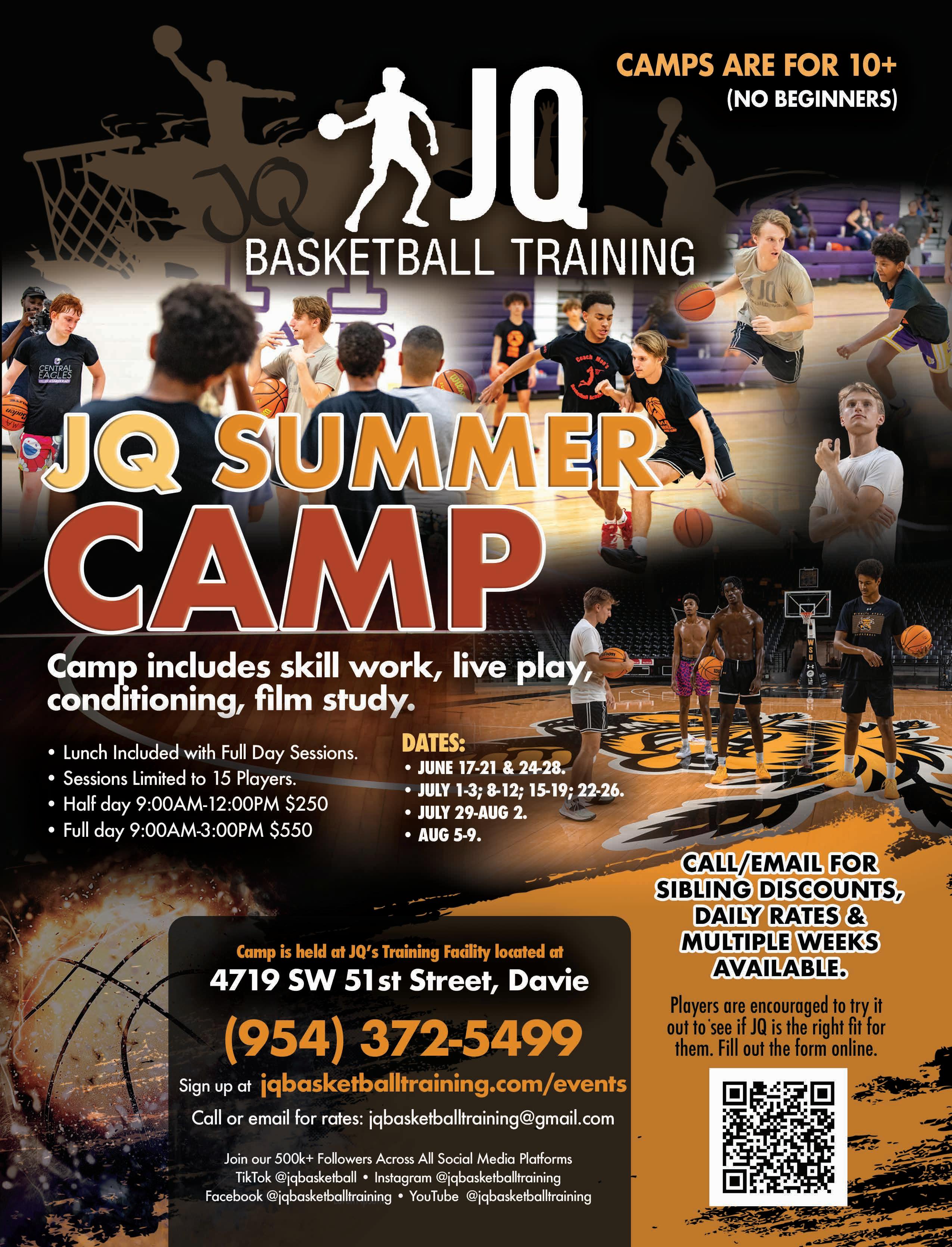 Have fun this summer at basketball training camp. Camp is for ages 10+. (Camp is not for beginners). Camp includes skill work, live play, conditioning, film study. Half day & full day sessions available. Lunch included with full day sessions. Session 1: 9:00AM-12:00PM. Session 2: 1:00PM-4:00PM Daily. Sessions Limited to 15 players. Sibling discounts available. Daily rates and multiple weeks available. Call or email for rates: jqbasketballtraining@gmail.com Dates: June 17-21 & 24-28. July 1-3; 8-12; 15-19; 22-26. July 29-Aug 2. Aug 5-9. Price $250/ half session; $500 full day session. Camp is held at JQ’s Training Facility located at 4719 SW 51st Street, Davie. Sign up at jqbasketballtraining.com/events. www.jqbasketballtraining.com, (954) 372-5499.