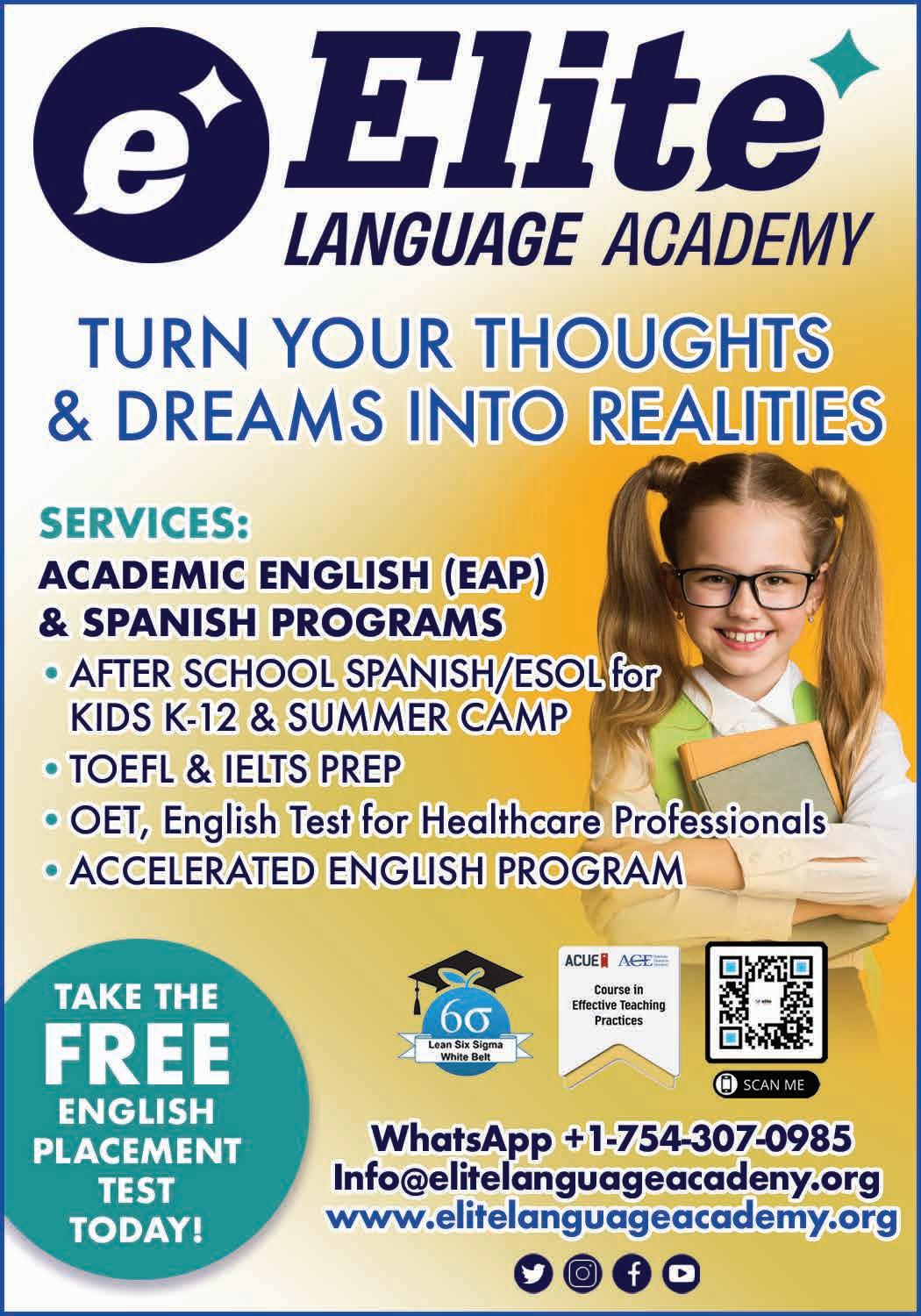 1792 Bell Tower Lane, Weston 33326. WhatsApp +1 (754) 307-0985. Office +1 (954) 954-315-3677. www.elitelanguageacademy.org.