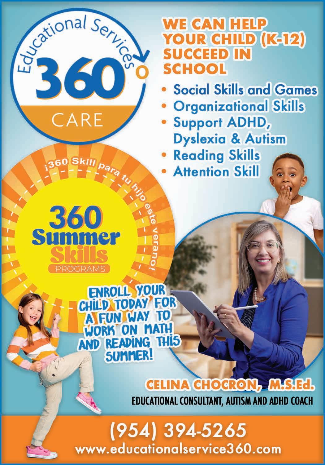 360 SUMMER SKILLS PROGRAM. If you are concerned about your child’s progress in class or want to improve those learning barriers, then this summer program is ideal for you. Students will improve reading and math skills while acquiring organization and attention skills with our six habits research-based program in an outdoor environment. This program is designed for students with ADHD, high functioning autism, or any learning challenge. We can accommodate students in our sessions based on their personal needs. REGISTER TODAY! (954) 394-5265 or email Info@educationalservice360.com. Visit at www.educationalservice360.com Follow us on social media @educationalservice360. ¡Hablamos español!