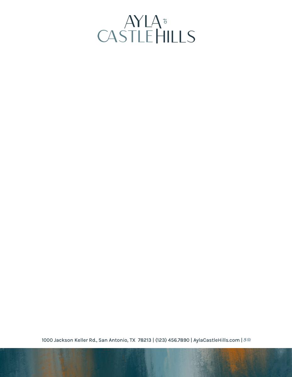 Inside, you’ll find everything you need to stay true to the Ayla at Castle Hills brand. It is full of tools and inspiration that guide the look and feel of your internal and external marketing communications.