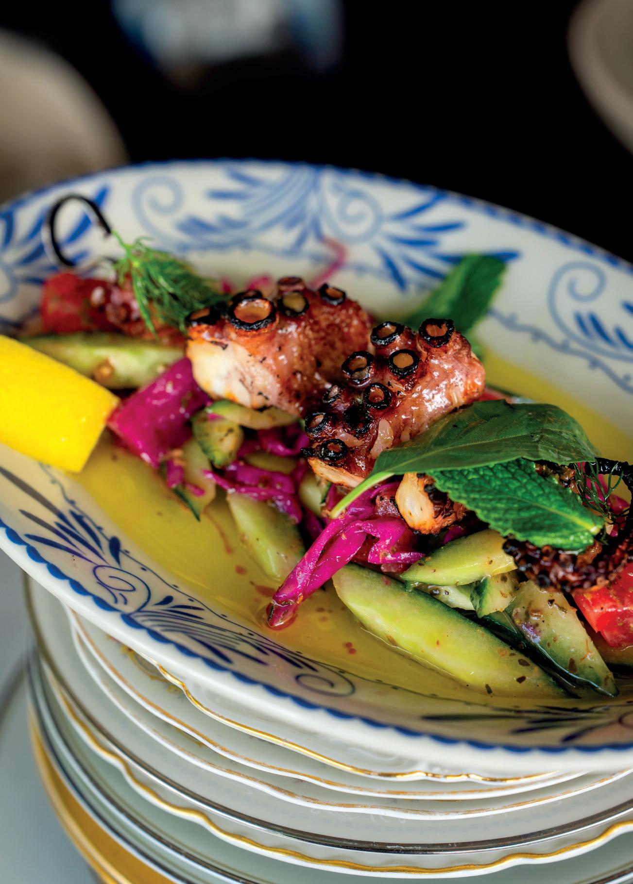 grouper and char-grilled octopus in spicy brava sauce. “Each plate is really a work of art,” Kaplan says. The restaurant currently offers a weekday happy hour from 4:30 to 6:30pm, which is popular with locals and hotel guests alike. There are also plans in place for some fun future programs, like live music by the pool and perhaps some local circus performances in the lobby.