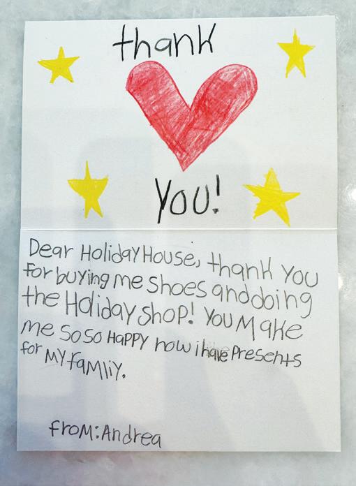 MISSION MOMENT: In addition to providing holiday gifts, Holiday House SRQ is committed to addressing critical needs within the schools. Previous efforts include distributing brand new sneakers to every student at Alta Vista Elementary, ensuring all students had comfortable and supportive footwear. Other needs ful lled included eliminating lunch debts, and providing families most in need with essential supplies to get them through winter break. The commitment continues this year as the organization now builds uniform closets where students in need can select items at no charge.