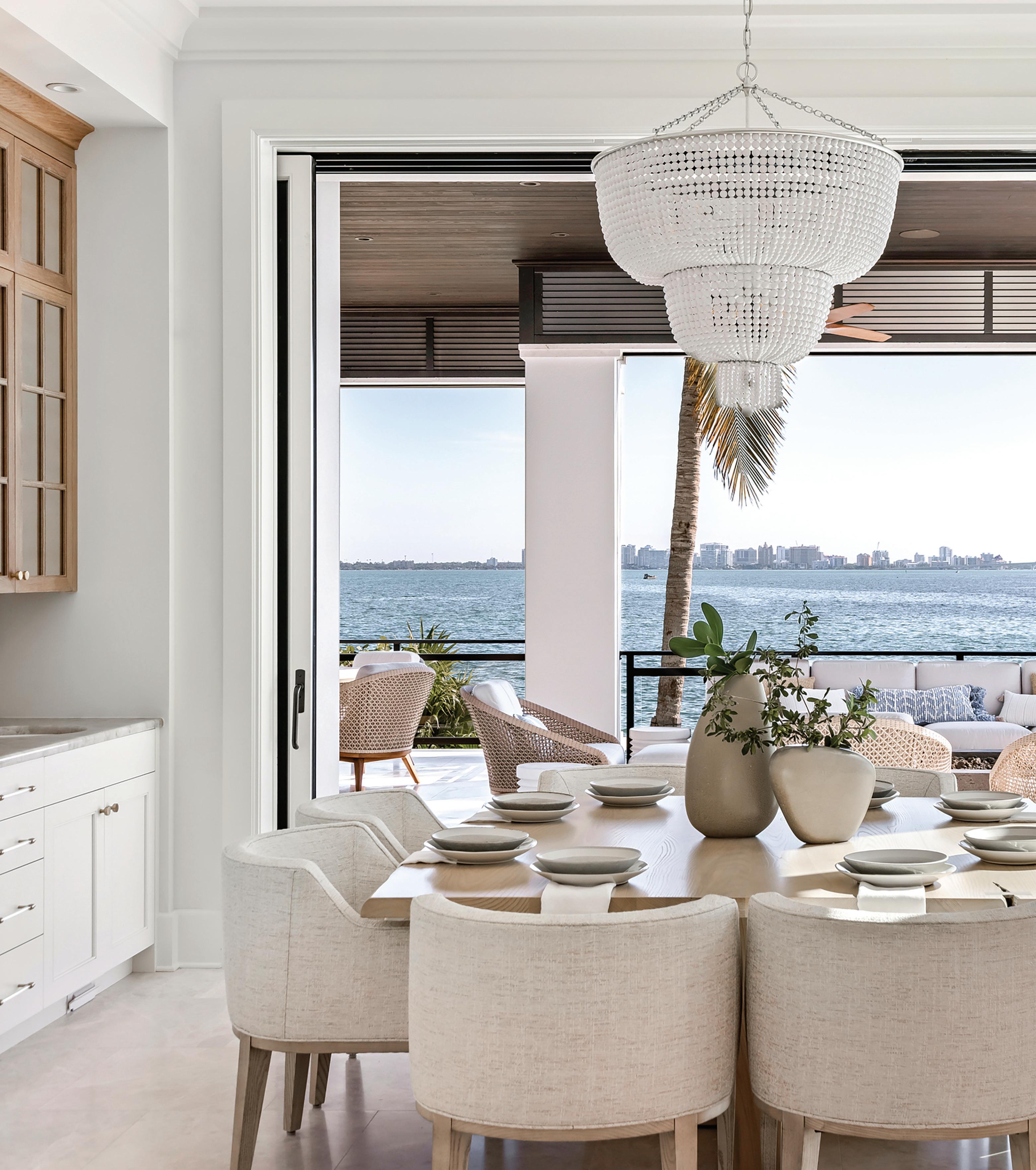 siderations of the clients are addressed through striking architectural features and intelligent design choices. Both the living room and the dining room feature massive sliding glass doors that open up to offer sweeping views of Sarasota Bay. When open, the doors allow guests to move between spaces like the grand great room and well-equipped outdoor kitchen with ease.
