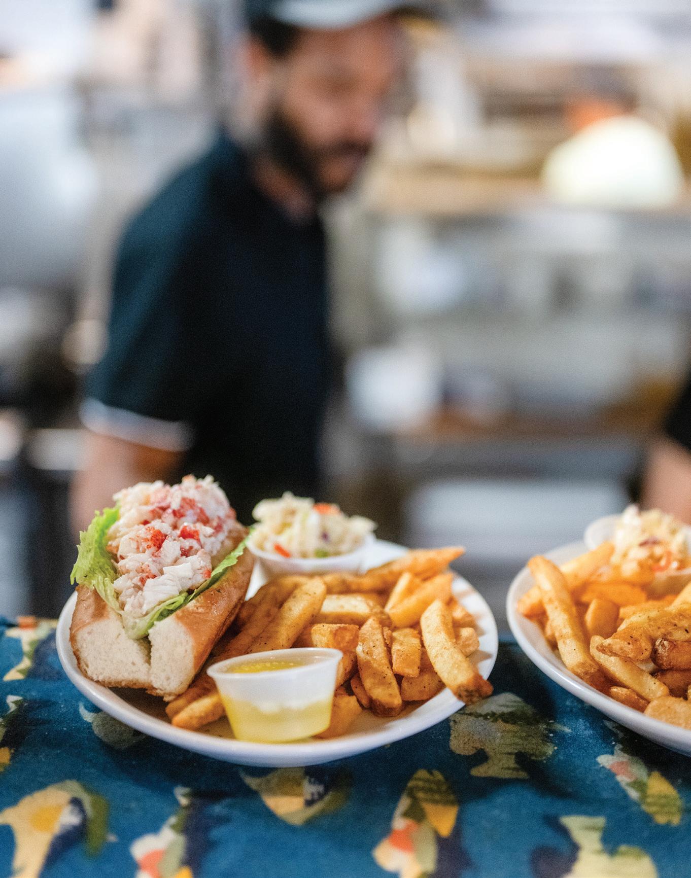 This page, clockwise: Shallot mayo and Maine lobster come together in this take on a chic New England lobster roll; visit the seafood counter at Lucky Pelican Bistro; Lucky Pelican Bistro puts their own international twist on traditional seafood dishes.