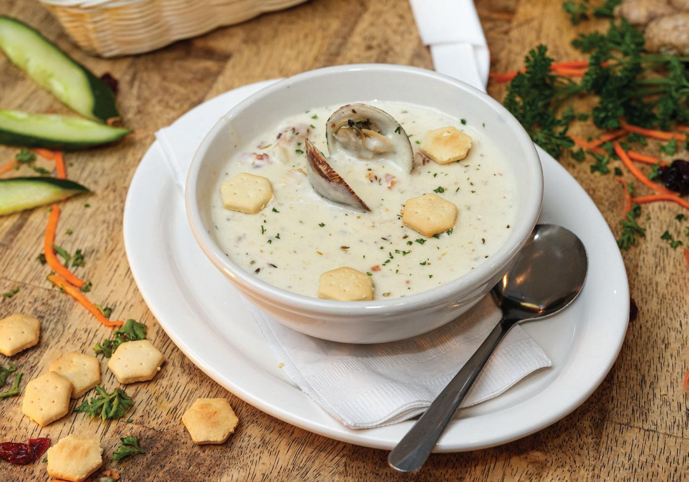 Below, left to right: CEO Andy Guz of Lakewood Ranch Medical Center and Lucky Pelican Bistro’s clam chowder.
