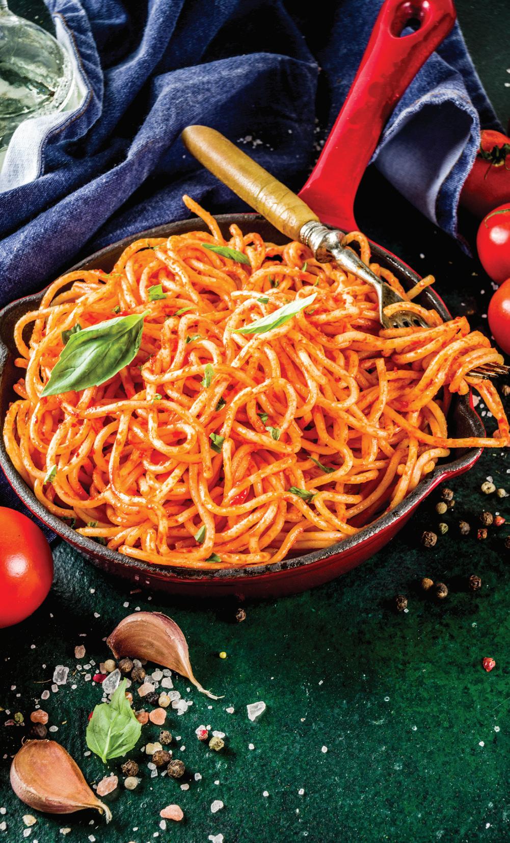 BELOW Spaghetti with ricotta, cherry tomatoes and pistachios, a favorite recipe from Chris Cannata.