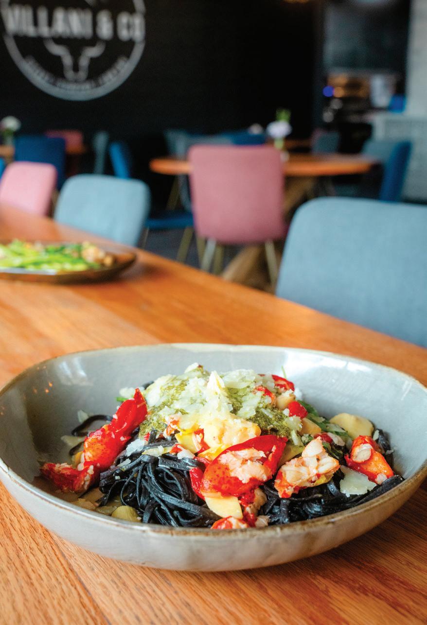 CLOCKWISE BELOW Grilled Texas Redfish on the half shell at Villani & Co. Rico Higgs, Christine Cannata, Ali Johnston and Eric Johnston. Squid ink pasta linguini.