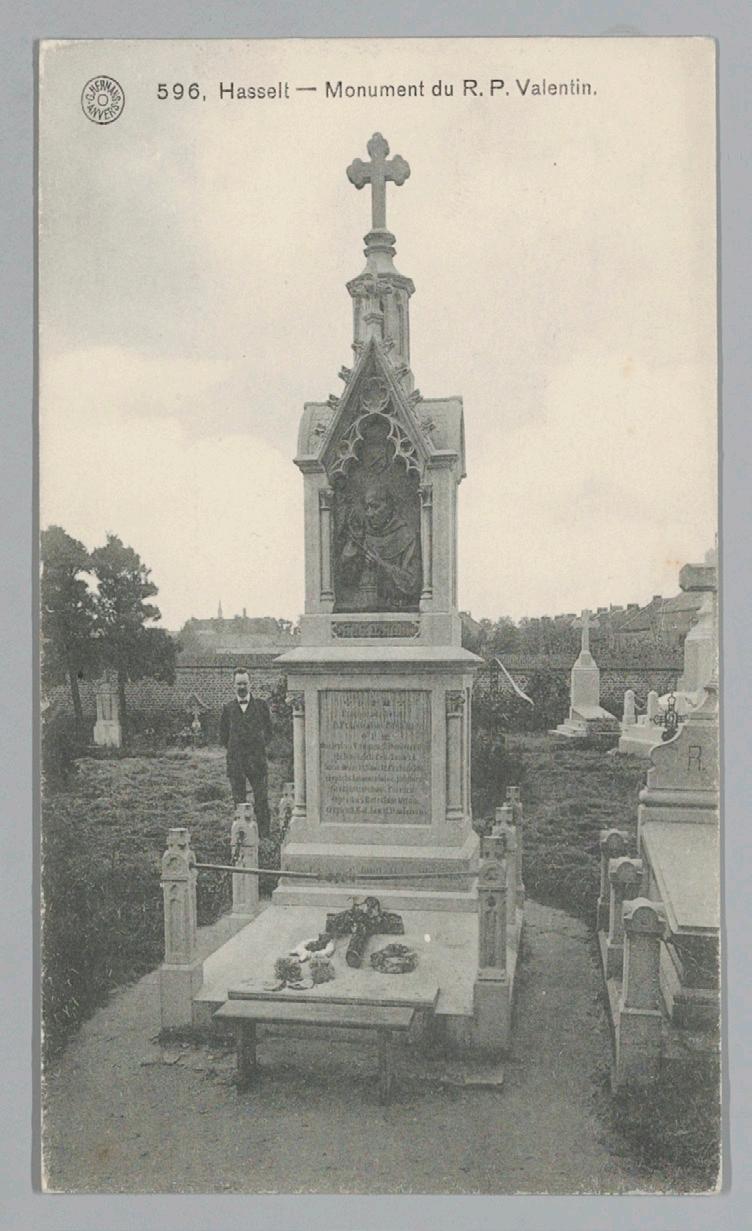 Een man poseert fier langs het graf van pater Valentinus Paquay, beter gekend als het Heilig Paterke, op het Oud Kerkhof. Een precies jaartal is moeilijk op het kiekje te plakken, maar het moet tussen 1905 – zijn sterfjaar – en 1926 zijn, toen zijn stoffelijk overschot werd bijgezet in de grafkapel naast de Minderbroederskerk. Het grafmonument verhuisde op zijn beurt naar de tuin van de kerk en op het Oud Kerkhof werd een herinneringssteen geplaatst ter