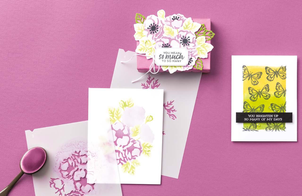 Dimensionals, Stampin’ Ink, Stampin’ Mist, Stampin’ Pad, Stampin’ Scrub, Stampin’ Spot, Stampin’ Up! and the Stampin’ Up! box logo, and Stampin’ Write are registered trademarks of Stampin’ Up!, Inc. Glue Dots is a registered trademark of Glue Dots International, LLC. Memento, StāzOn, and VersaMark are registered trademarks of Tsukineko Co., Ltd. Wink of Stella is a registered trademark of Kuretake Co., Ltd.