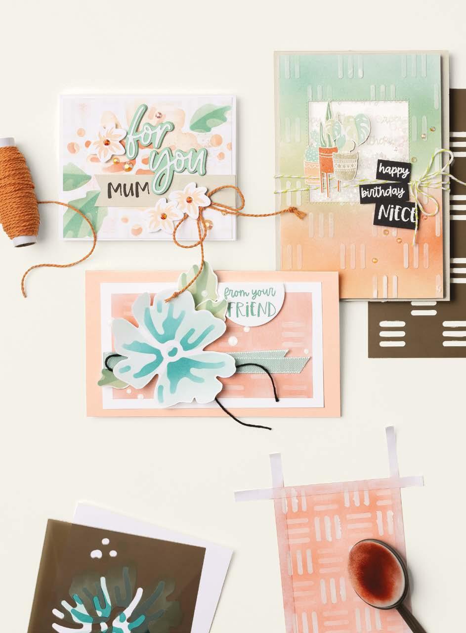 The contents of this catalogue are protected by the Australian and New Zealand copyright and trademark laws. Reproduction of the catalogue or any portion thereof is strictly prohibited. Purchasers of Stampin’ Up! products are authorised to sell hand-stamped artwork made with our copyrighted designs only in accordance with Stampin’ Up!’s Angel Policy, a copy of which can be found on the Stampin’ Up! website at stampinup.com.au/angel-policy or stampinup.nz/angel-policy or obtained from a Stampin’ Up! demonstrator. Permission is not granted to mechanically reproduce stamped images.