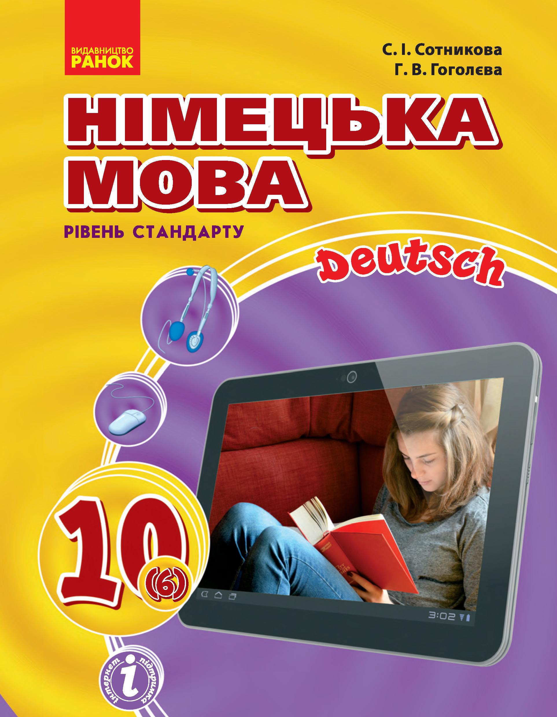 Deutsch (6. Lernjahr, Standardkurs) : Lehrbuch für die 10. Klasse der allgemeinbildenden Schulen. / Svitlana Sotnykova, Ganna Gogolyeva. — Charkiw: Verlag «Ranok», 2018. — 208 Seiten.