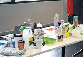 Among the selection of items displayed in the session were take-away coffee cups, milk and juice containers, class soft drink bottles, black plastic trays and reusable plastic shopping bags.