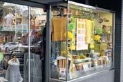 Barry and Kay from Crumbz Craft have hung pom poms and scarves in their shop front.