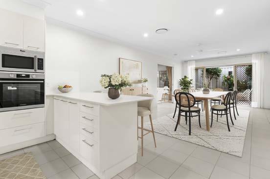 Have a penchant for a contemporary chic? Come inside. Thanks to the idyllic aspect, natural light sashays across the pale sandyhued tiles in the living space with its on-trend laidback look, muted grey sink-into sofa, ottoman, custom cabinetry and seaside-themed artwork.
