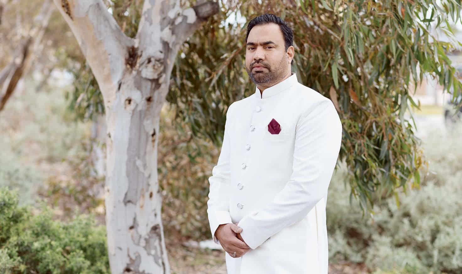 Aijaz Moinuddin standing in front of eucalyptus trees to exemplify unity between Australian and Indian