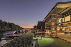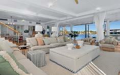 The living, dining, and kitchen space opens to panoramic views of the Noosa River and distant hinterland, evoking the feeling of being