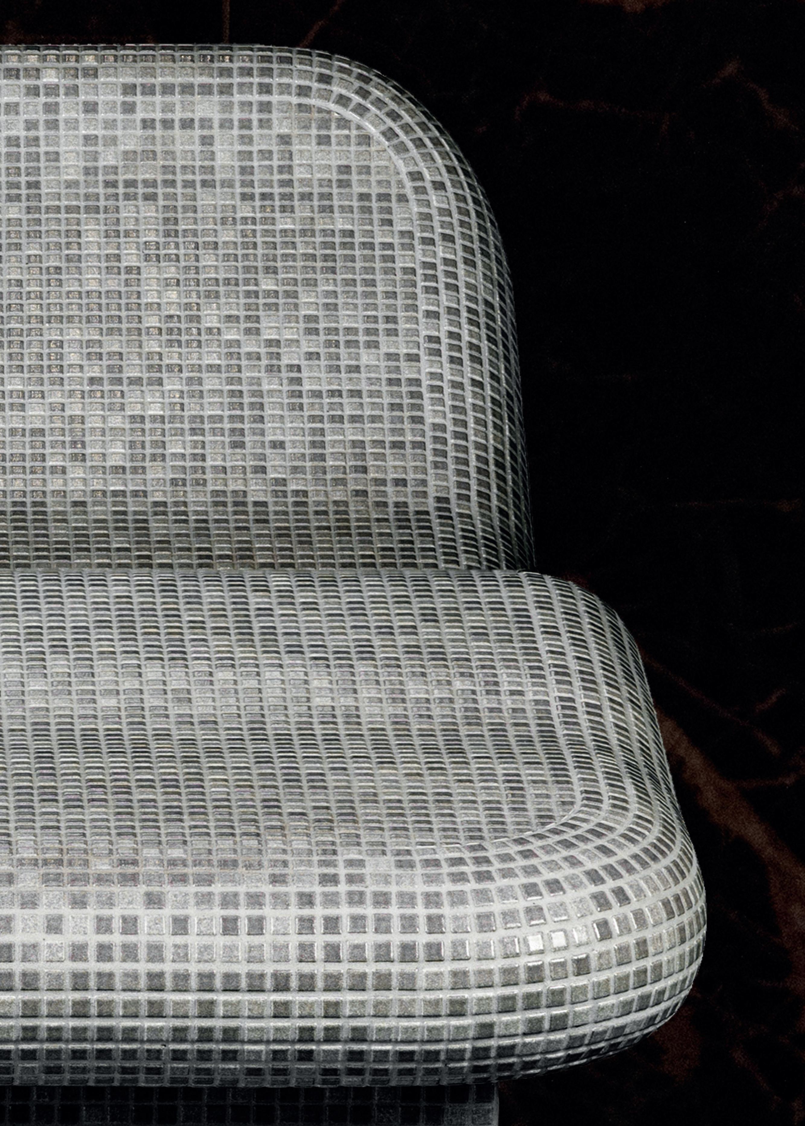 Eine zeitlose Erscheinung, die sich durch abgerundete Ecken und eine extrem weiche Polsterung und klare Linien auszeichnet, die den Körper in den Momenten der regenerierenden Ruhe begleiten und unterstützen. Dieser Sitz ist das perfekte Beispiel dafür, wie Wohnen und Schlafen in einem einzigen Objekt koexistieren können.