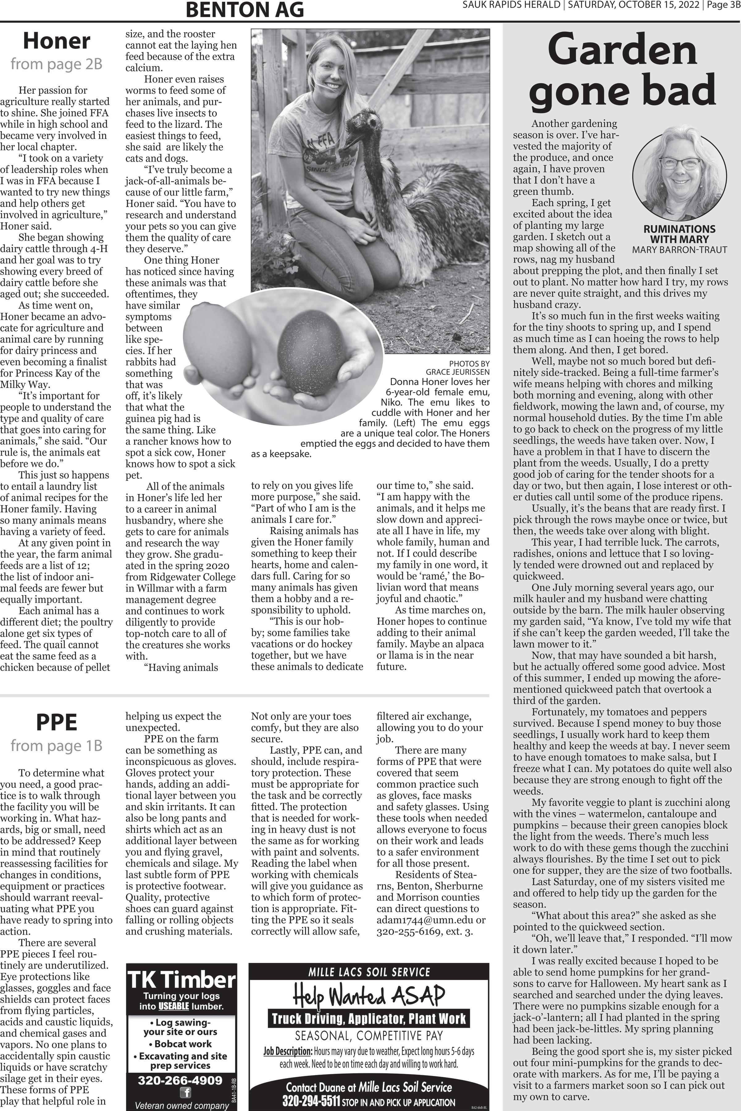 Page 2B | SATURDAY, OCTOBER 15, 2022| SAUK RAPIDS HERALD BENTON AG POWER & UTILITY: New Holland PowerStar™ Series tractors are the ideal blend of power and utility. Five models from 65 to 100 PTO horsepower are built to handle jobs in the back field, the barnyard, and everywhere in between. You’ll do it all with ease and comfort in the spacious VisionView™ cab with best-in-class visibility and the ergonomic Command Arc console. Choose between a 2WD or 4WD front axle, a transmission with a mechanical or power shuttle, and loads of factory-installed loader options to suit your needs. Put the combination of power and utility to work in a new PowerStar™ Series tractor. Stop in today or visit newholland.com. OUTSTANDING CAPACITY, There’s a New Holland Roll-Belt™ round baler that’s right for your hay operation. Whether 4’x5’, 4’x6’ or 5’x6’, all models feature wide, durable pickups and smooth feeding systems with the capacity for faster baling. Innovative Precision Land Management (PLM™) solutions like IntelliBale™ automation, in-cab density control and factory-installed moisture sensing help you make smart decisions on the go. You’ll get the high bale density you expect for savings you can take to the bank. Increase your haymaking productivity with a Roll-Belt round baler. Stop in today or visit newholland.com to learn more. © 2022 CNH Industrial America LLC. All rights reserved. New Holland is a trademark registered in the United States and many other countries, owned by or licensed to CNH Industrial N.V., its subsidiaries or affiliates. © 2022 CNH Industrial America LLC. All rights reserved. New Holland is a trademark registered in the United States and many other countries, owned by or licensed to CNH Industrial N.V., its subsidiaries or affiliates. www.modernfarmequipment.com SAUK CENTRE, MN 320-352-6543 Hwy. 71 South PIERZ, MN 320-468-2161 Hwy. 27 West BA41-1B-WS BA14-1B-BP P E O P L E...P R O D U C TS...K N OW L E D G E... PEOPLE...PRODUCTS...KNOWLEDGE... Stop in or give us a call for more information! To help serve your seed, application, fertilizer, precision and AgChem needs. Helena Agri-Enterprises, LLC 16250 HWY 10 NW Royalton, MN W E H AV E 3WE HAVE C E R T I F I E D C R O P A DV I S O R SCERTIFIED CROP ADVISORS (320) 584-5520 BA2-1B-BL Oak Park Co-op Creamery 3 2 0 . 9 6 8 . 7 8 6 4 320.968.7864 16623 Ironwood RD NE, Oak Park, MN Store h o ur s M F 8 to 5 & S at 8 to 12hours: M-F Sat Twine & Net Wrap For Your Corn Stalk Bales EARLY ORDER & PAY ON SEED BA41-1B-RB