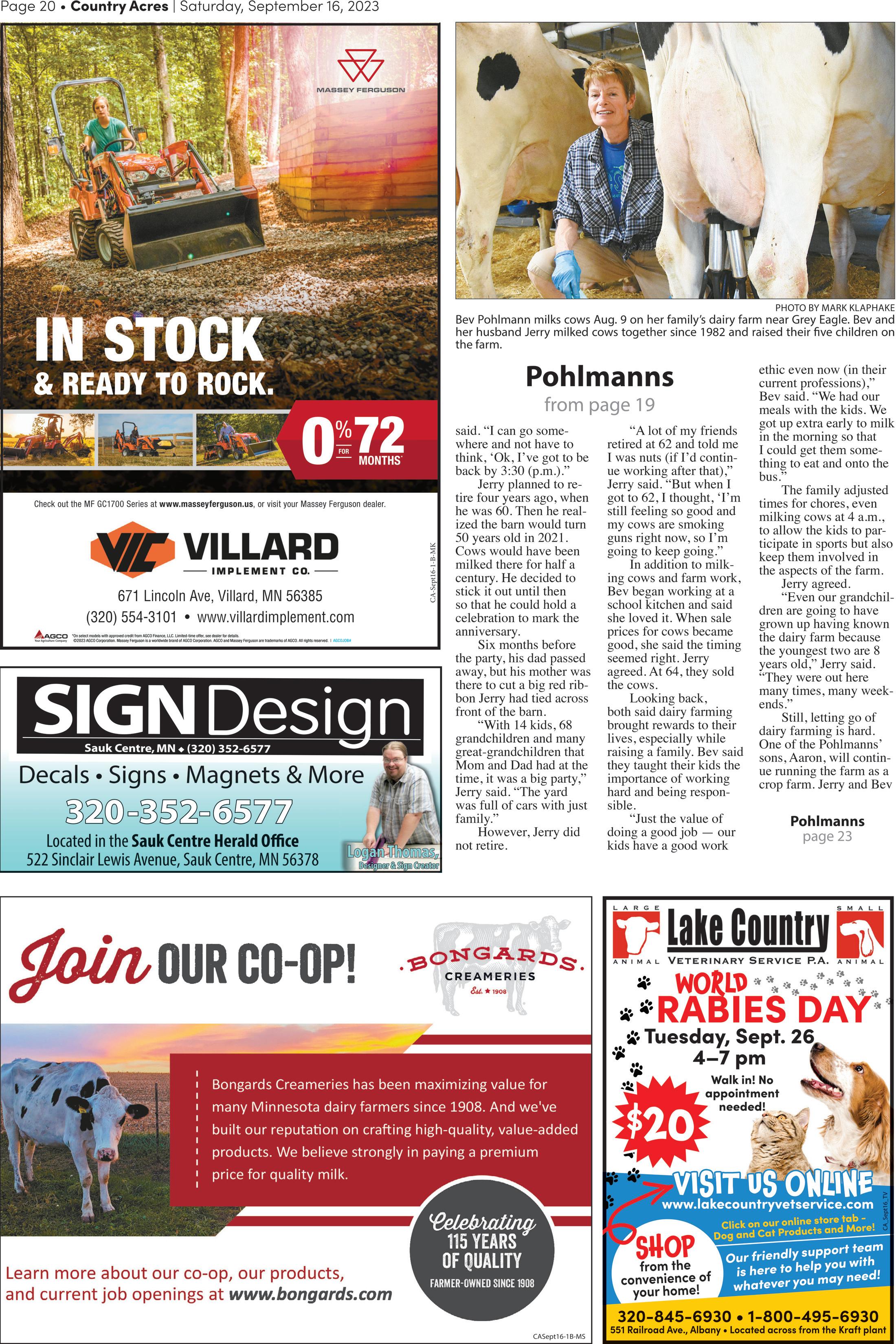 Saturday, September 16, 2023 | Farm Families of the Year | Country Acres • Page B7 320-632-9240 1800 1st Ave. NE, Ste 101 | Little Falls Agron. 320.468.2509 Petro. 320.468.2509 Feed. 320.468.6655 WWW.PIERZCOOP.COM PIERZ - GENOLA Congratulations to all farm families of the year! Thank you for your dedication to the farming industry. Tillage Products Center Pivot Irrigation SAUK CENTRE, MN 320-352-6543 • Hwy. 71 South PIERZ, MN 320-468-2161 • Hwy. 27 West Store Hours: Monday-Friday 8-5, Saturday Seasonal www.modernfarmequipment.com www.mmcjd.com LITTLE FALLS 16069 Hwy 27 East 320-632-5469 PRINCETON 3708 Baptist Church Road 763-389-3453 SAUK RAPIDS 1035 35th Ave NE • 320-252-2010 PAYNESVILLE 725 Lake Avenue South 320-243-7474 SAUK CENTRE 1140 Centre Street • 320-352-6511 $300 $300