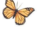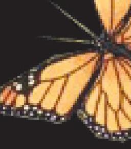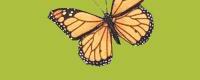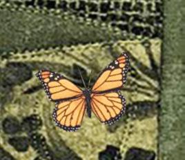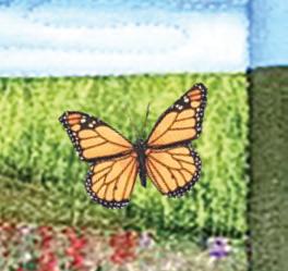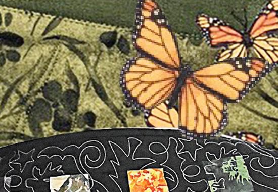 Three butterflies fly on the scene of a quilt by Sandra Borgschatz. She