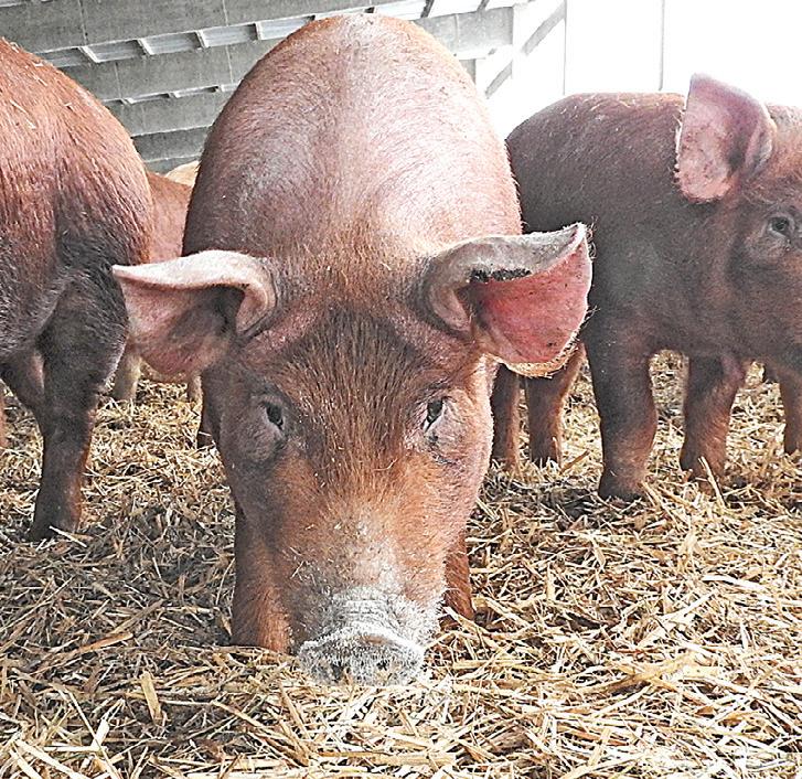PHOTO SUMBITTED Red wattle pigs stand on straw at Pork & Plants near Altura. The pigs are fed a diet with no corn or soybeans.