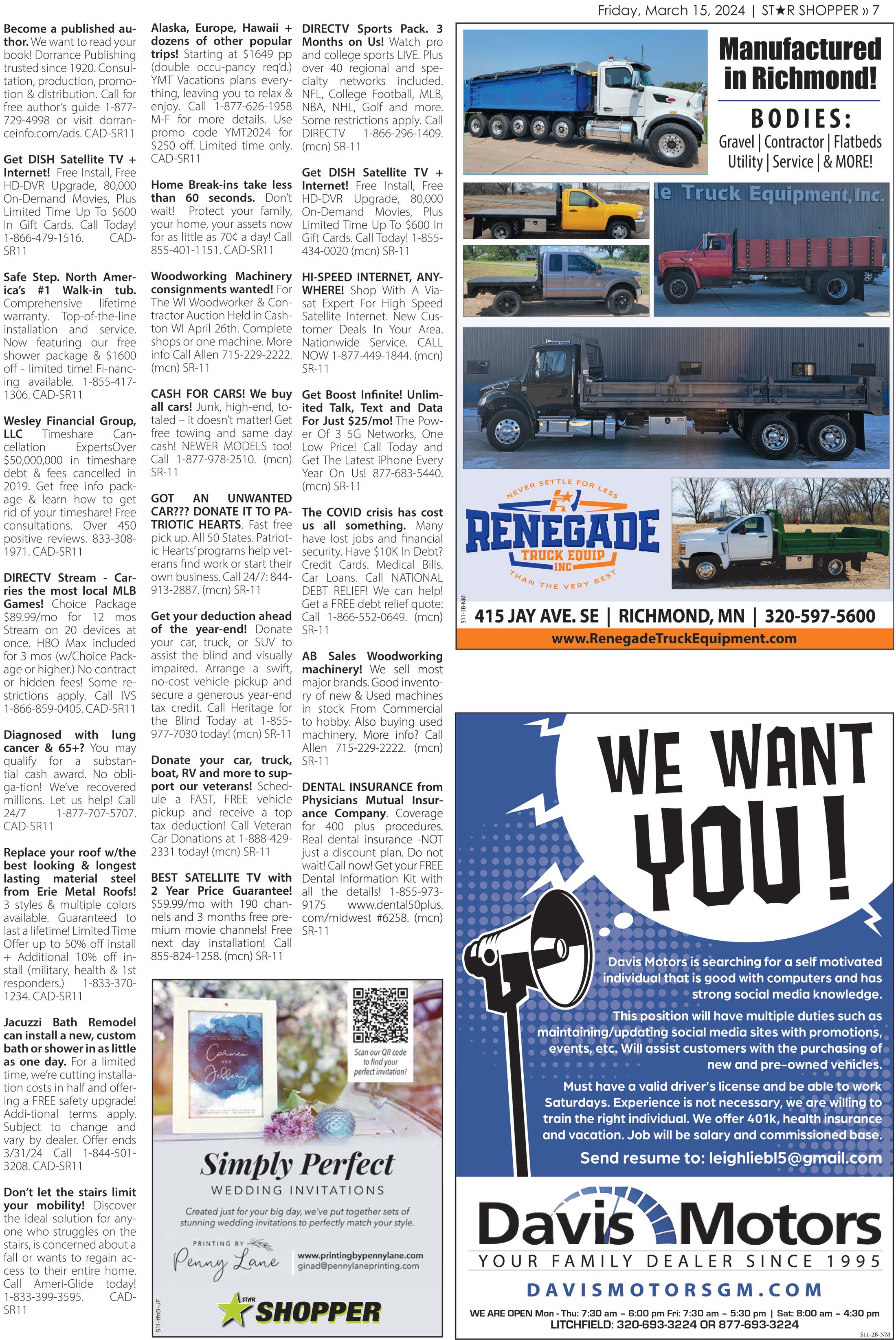 R SHOPPER » 9 Friday, March 15, 2024 | ST MID-MINNESOTA REAL ESTATE/FOR RENT The Best Place to Advertise Your Real Estate... the STAR Shopper - Reaches over 15,600 households each week! SILVERCREST APARTMEN 320-493-6343 412 10th St. S, Sauk Centre, MN has openings for Senior Living at its best Call Today! st HS10_2B_RB SALES, SERVICE, PARTS: 320-243-4235 TOWING: 320-248-1148 640 W HIGHWAY 23, PAYNESVILLE, MN 56362 www.yarmonford.com 0% S11-1B-MS for 48 MONTHS At 10:00 a.m. at Yarmon Ford ON ALL BRAND NEW FORD EDGES EASTER SATURDAY, MARCH 23 EgG HuNt More details to follow. Check out our website!! Coupon must be present at time of service. One coupon per visit, not valid with other offers. Excludes tires. Contact Advisors for full details. Expires 4/30/24 Coupon must be present at time of service. One coupon per visit, not valid with other offers. Excludes Diesels. Contact Service Department for full details. Expires 4/30/24 Coupon must be present at time of service. One coupon per visit, not valid with other offers. Contact Service Department for full details. Expires 4/30/24 Coupon must be present at time of service. One coupon per visit, not valid with other offers. Contact Service Department for full details. Expires 4/30/24 Coupon must be present at time of service. One coupon per visit, not valid with other offers. Contact Service Department for full details. Excludes tires. Expires 4/30/24 UP TO $100 OFF SYNTHETIC BLEND OIL CHANGE & MORE* W/ TIRE ROTATION SPEND • Tire Rotation & Pressure Check • Brake Inspection • Vehicle Checkup • Fluid Top-Off • Battery Test • Filter Check • Belts & Hoses Check* Up to 6 quarts. SPEND SAVESAVE $100-$199......... $10 $200-$299....... $20 $300-$399....... $30 $400-$499....... $40 $500-$599....... $50 SPEND MORE, SAVE MORE THE WORKS®PACKAGE FREE BRAKE INSPECTION FREE BATTERY CHECK 10% OFF ACCESSORIES & PARTS $59.95 $600-$699....... $60 $700-$799........ $70 $800-$899....... $80 $900-$999....... $90 $1000+............. $100 Albany Apartment FOR RENT 2 bedroom • 1 Bath $750/month, $100 deposit. No Dogs. Call for availability, Loreen 763-238-0616 SP10-tfnB-TV 122 Sinclair Lewis Ave, Sauk Centre–3 bed, 1.75 bath home with a single detached garage & a large double detached garage in back! Home features newer steel siding & shingles. PRICE REDUCED$199,000 BUYING OR SELLING YOUR HOME? 508 MAIN STREET, SAUK CENTRE I personally have over 21 years experience helping people buy & sell real estate in the Sauk Centre area. Peter Nelson Broker-Owner CALL, TEXT OR EMAIL FOR A CONSULTATION 320-760-4816 • peter@MSRealEstateServices.com Office: 320-352-6736 • www.MSRealEstateServices.com S O LD S O LD S O LD S O LD S O LD S O LD S O LD S O LD S O LD S O LD S O LD S O LD S O LD S O LD S O LD S O LD S O LD SOLD SOLD SOLD SOLD SOLD SOLD SOLD SOLD S O LD S O LD S O LD S O LD S O LD S O LD S O LD S O LD 233 Daybreak Lane, Sauk Centre–This 2 bed, 1.75 bath patio home features comfortable in-floor heat, 9' ceilings, recessed lights, pullout cabinet drawers, gridded vinyl windows, tile, carpet, laminate flooring & a walk-in closet. You’ll love the sun porch with gas fireplace! Association takes care of snow, lawn mowing & sprinkling. $280,000. JUST LISTED! 520 4th St S, Sauk Centre–Check out this great investment opportunity! Entire main floor and basement is 1 leased commercial space. There are two 1 bed, 1 bath apartment units above. An owner could live in and rent out the other! 3 separate electric meters. This property is well kept and has newer carpet, $239,900. 101 SUNRISE TRAIL, SAUK CENTRE–Welcome home to this impressive 4 bed, 3.5 bath 2 story home with attached heated garage! This home features a gas fireplace, granite counter tops, maple cabinets, open front porch, large deck and a stamped concrete patio! $389,900 S11-1B-MT PENDING PENDING BOGO 40% OFF OFFER ENDS 4/30 855-502-6514 SR11-1B-JF Brought to you by DISH Get Boost Infinite 1-877-683-5440 Plans starting at $25/mo Unlimited Talk, Text and Data America's Smartest Network Smart Switching Between 3 Wireless Networks INFINITELY BETTER WIRELESS! Get the latest iPhone every year with unlimited wireless for $60/mo iPhone 15 included with no trade-in needed to get started UnlimitedTalk, Text and Data Free upgrade to the latest iPhone EVERY YEAR. SR11-1B-JF Call today and receive a FREE SHOWER PACKAGE PLUS $1600 OFF With purchase of a new Safe Step Walk-In Tub. Not applicable with any previous walk-in tub purchase. Offer available while supplies last. No cash value. Must present offer at time of purchase. CSLB 1082165 NSCB 0082999 0083445 1-855-417-1306 SPECIALOFFER SR11-1B-JF DIAGNOSED WITH LUNG CANCER