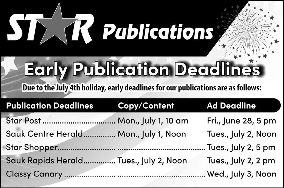 753 Grove Lake St. S Sauk Centre S25-1P Teenage & adult clothing, table with corner bench & lots of misc. EVERYTHING MUST GO! Sat., June 29 8:00 a.m. to 2:00 p.m. GARAGE SALE 11747 Bluegill Dr. Sauk Centre S25-1P Weeres 2011 20’ pontoon with Mercury 25 hp 4-stroke motor; 1983 Lund boat, trailer & motor; Vintage Duncan Phyfe drop-leaf table; Vintage men’s Schwinn Bike; Red Wing pottery vases; Piano 1960s, Roll-top desk, Treadmill Schwinn; Stanley dining table, chairs & buffet; Household decor; Many, misc. items Friday, June 21 8:00 a.m. to 4:00 p.m. Saturday, June 22 8:00 a.m. to 1:00 p.m. 4-PARTY GARAGE SALE