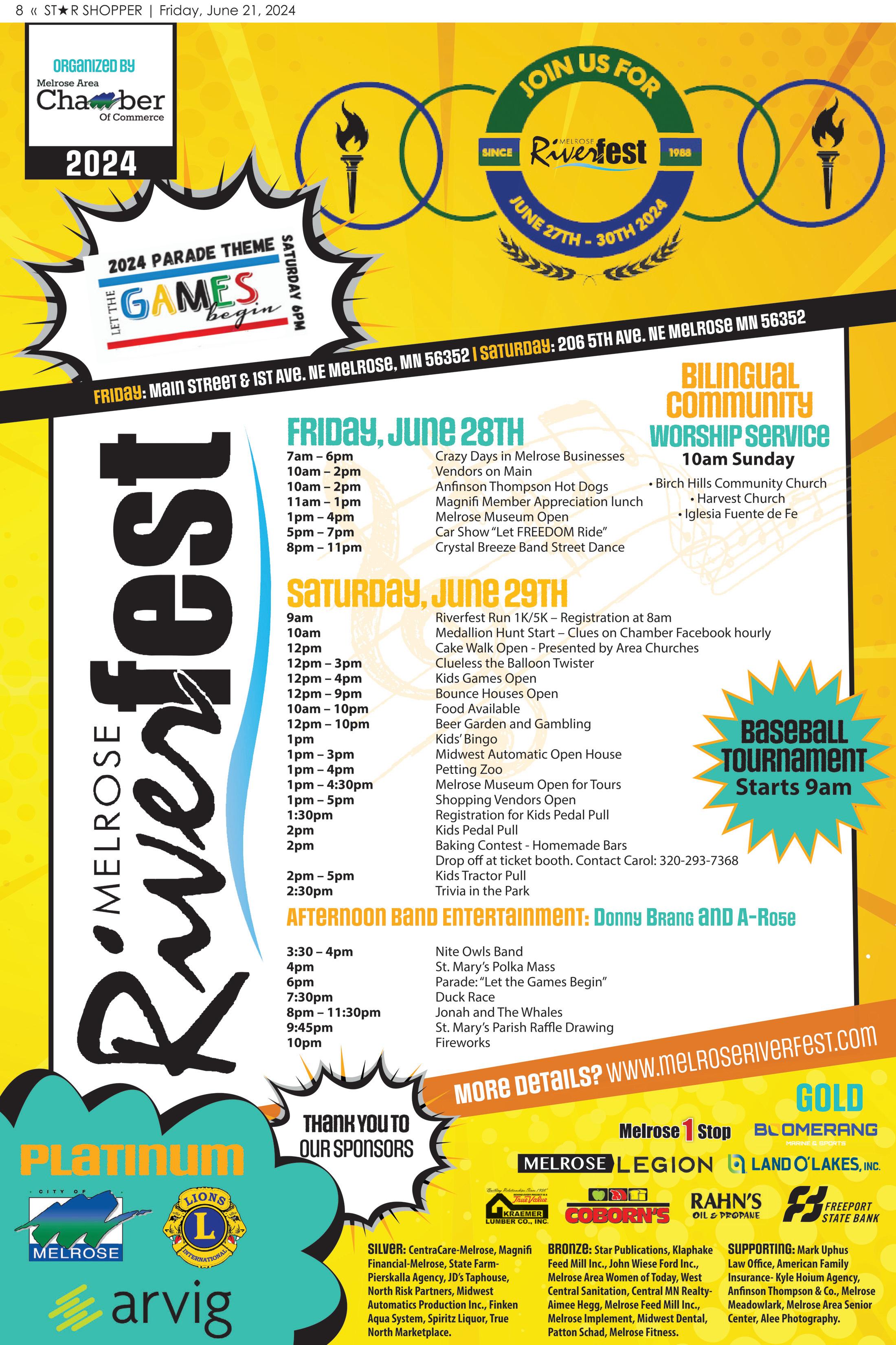 10 « STR SHOPPER | Friday, June 21, 2024 Unlimited golf for $25 every day after 3:00pm 837 Country Club Dr. Melrose, MN 320-256-4989 www.meadowlarkcountryclub.com TWILIGHT RATE CALL FOR A TEE TIME! 119 North 8th Avenue West P.O. Box 234 Melrose, MN 56352 320-256-3846 HAVE A GREAT TIME AT Riverfest! Residential, Commercial and Industrial Wiring Design / Build Construction Residential | Commercial | Farm Pickup | Demolition | Recycling wm.com 10, 20 & 30 Yard Dumpsters Available & 32, 64 & 96 Gallon Trash Containers 39864 South Hwy. 71, Sauk Centre, MN • wm.com Schedule your garbage or dumpster pickup today! ntreMN 320-256-8655 • 415 Main St. E., Melrose MN 56352 Come check out our CRAZY SALE PRICES during Days Boutique’s Hours: Tuesday-Friday 9 a.m. to 5 “ish” p.m. Saturday 9 a.m. to 1p.m. CRAZY DAYS CRAZY m. Friday, June 28th, 8:00 a.m.5:30 p.m. Come and visit Melrose during our annual celebration M E L R O S E