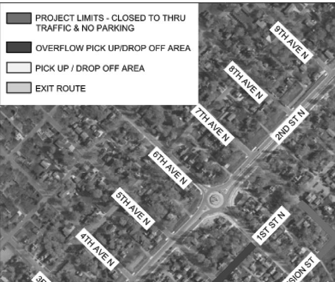 Guardians dropping off and/ or picking up students at Hillside School will do so at the main entrance facing Fifth Avenue South. The over ow line of vehicles will extend to the northwest along Fifth Avenue South and First Street North, with an access to the line from Sixth Avenue North.